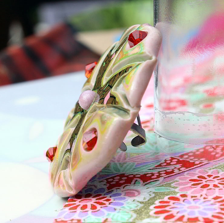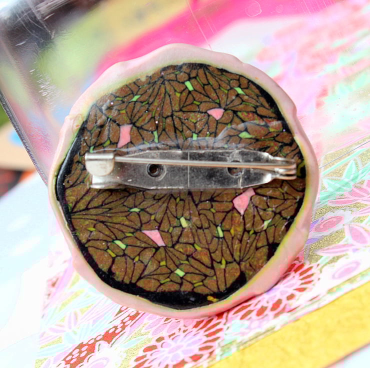 A charm of a brooch in rich and sparkling colors in fancy patterned and crafted polymer clay. Would surely adorn and complement whatever it's pinned to.
