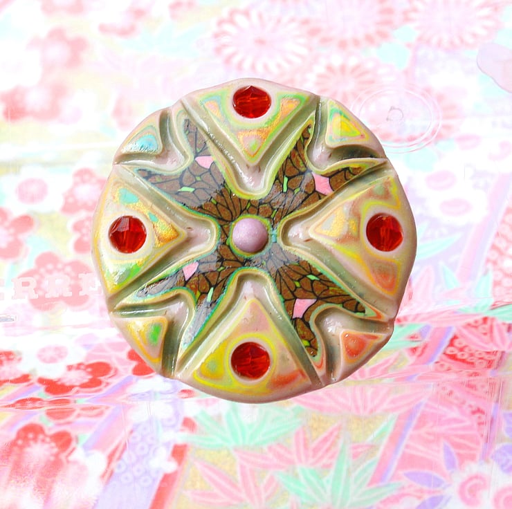 Crafted by myself from polymer clay with sparkling scarlet glass beads attached - finished and polished to a fine degree with a metal pin securely attached. It measures 5cm (2") across.