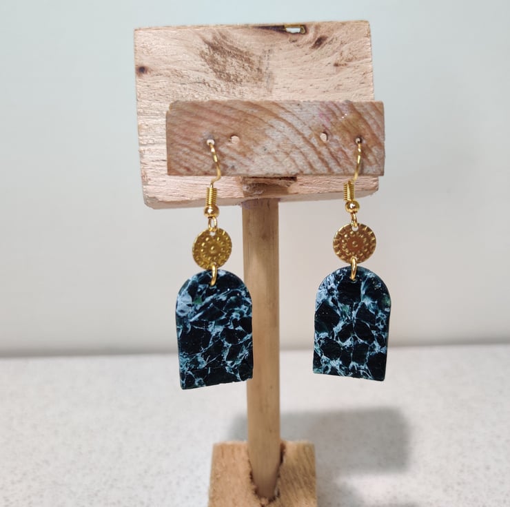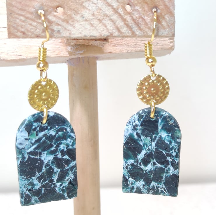 Hand made polymer clay earrings with a pattern of clay and acrylic paint connected to a gold colour embellishment and stud. Stud fixing can be painted with hypo allergenic coating for free on request. Please see all photos for close up detail. All products handmade therefore there may be minor imperfections. Please note the beads will come off the hook if you are not careful. Backs will be provided. Each pair sold as seen, message for more info