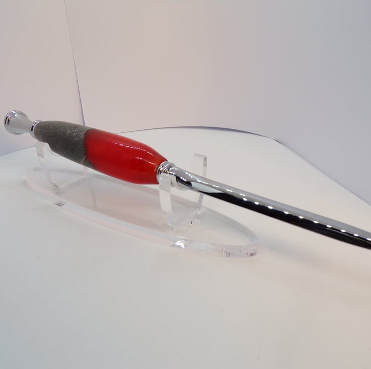A letter opener that is just over 170 mm long. Made from resin and stabilized wood. Chrome blade and finial to finish off. Ideal gift for friends or family. Makes letter opening so much easier.