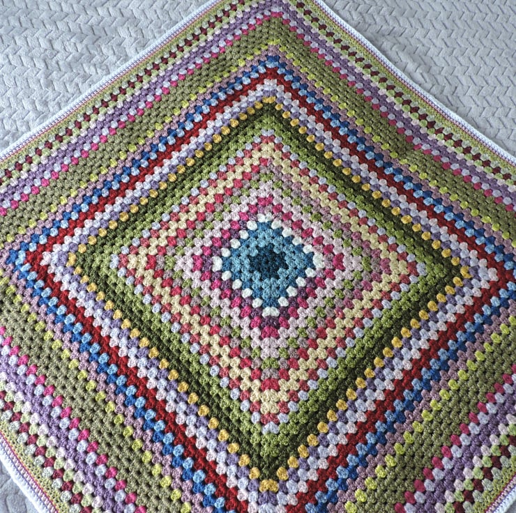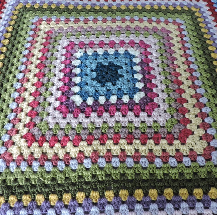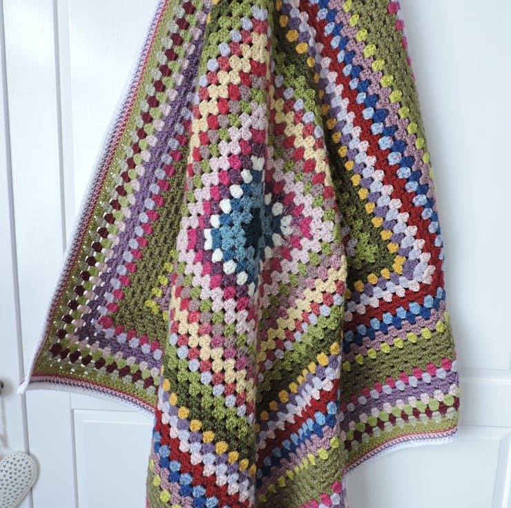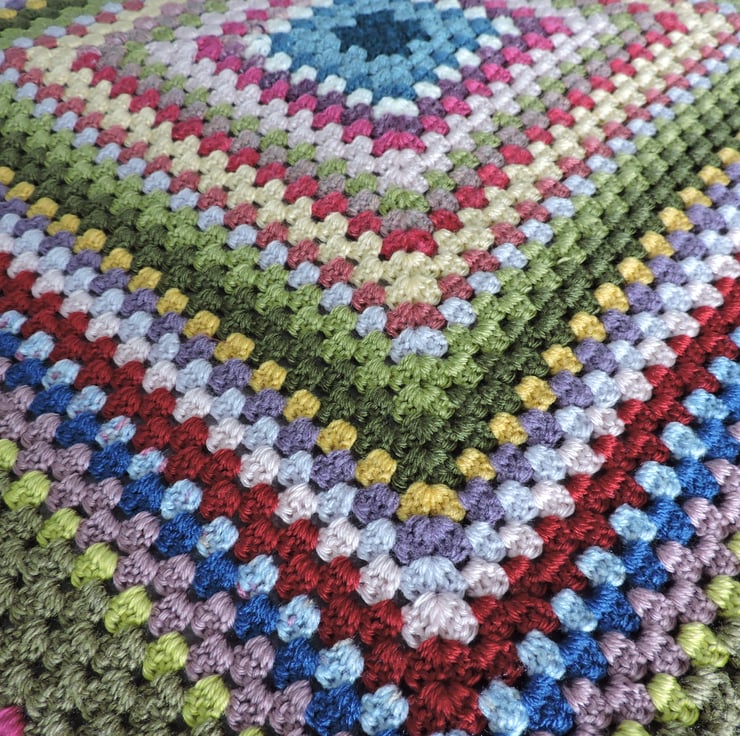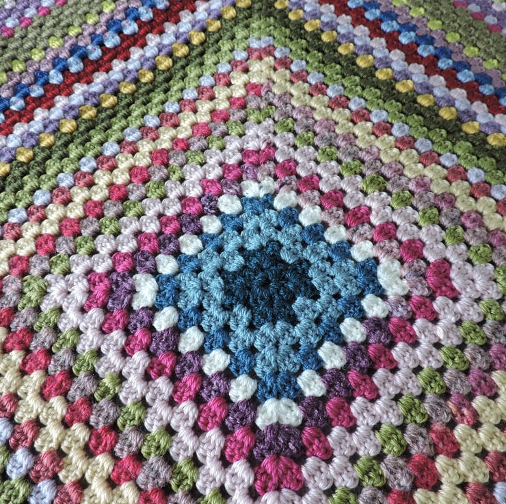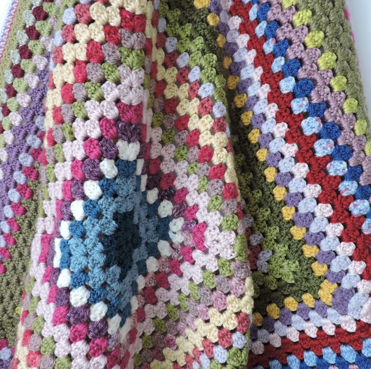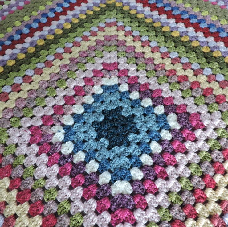 This crochet blanket has been made with 100% premium acrylic double knit yarns. Lots of lovely colours have been used for this granny square blanket in assorted greens, pinks, blues, yellows, mauves, reds and white.