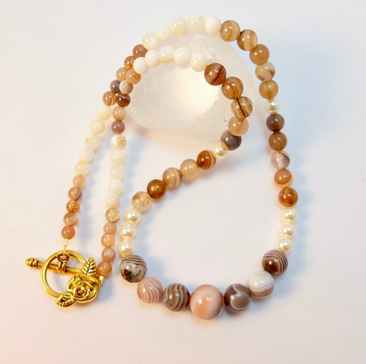 The necklace graduates from 6mm Agate to 5mm shell and 4mm Agate, and is finished with a Tibetan-style, 'antique gold', rose toggle clasp.