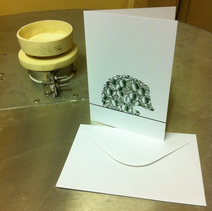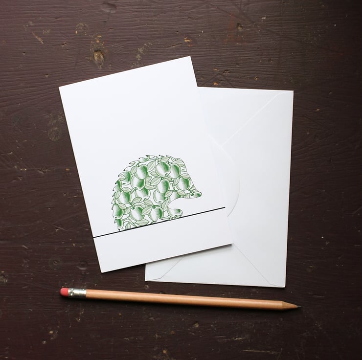 This Apple Hedgehog card is made from thick 340gsm, sustainably sourced paper stock. With a light satin coating on the outside, the inside is blank and left uncoated, making it easier for you to write your own message.