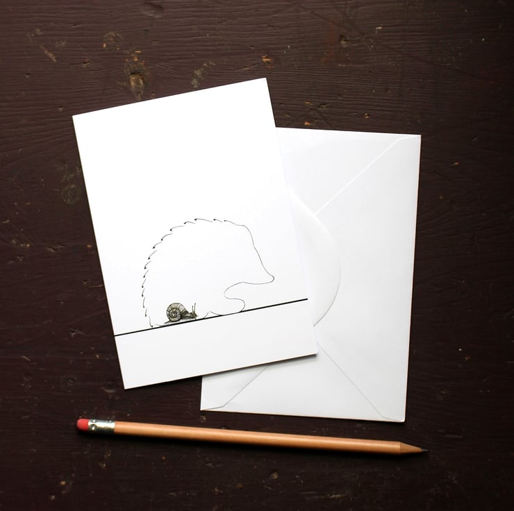 This Snail Hedgehog card is made from thick 340gsm, sustainably sourced paper stock. With a light satin coating on the outside, the inside is blank and left uncoated, making it easier for you to write your own message.