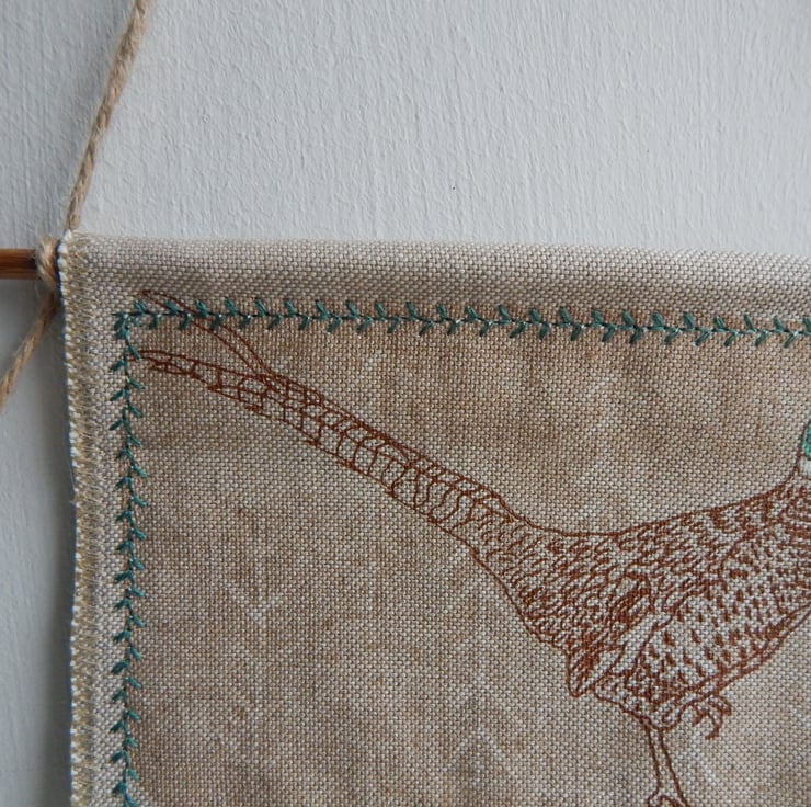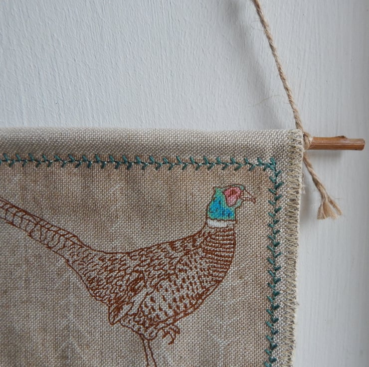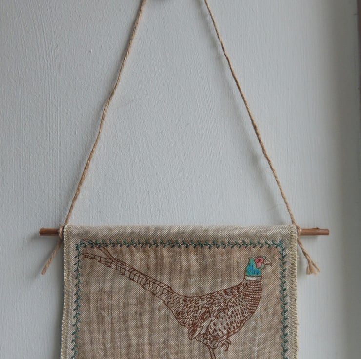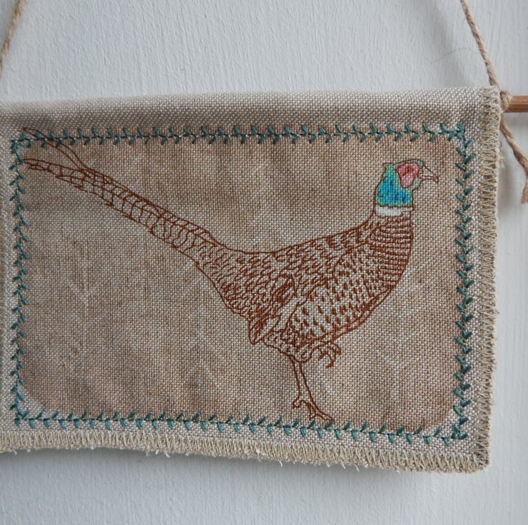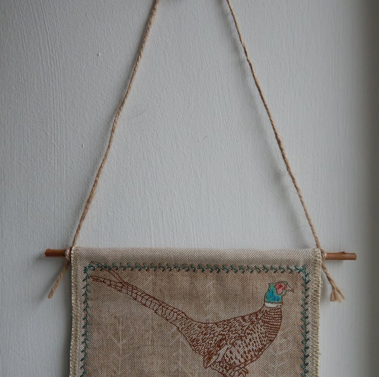This is a screen printed pheasant on a simple brown lino print background. He has his colourful head hand painted for a pop of colour. This has a couple of layers of cotton fabric for some stability and this is sewn onto a piece of willow, a simple hanging loop is made with a piece of hemp string connected from one end of the willow to the other.