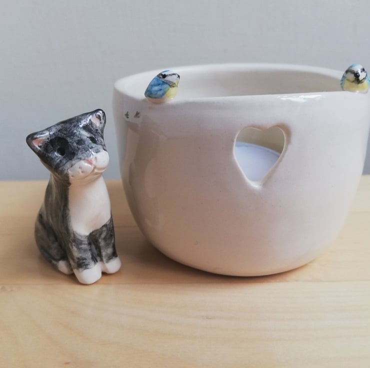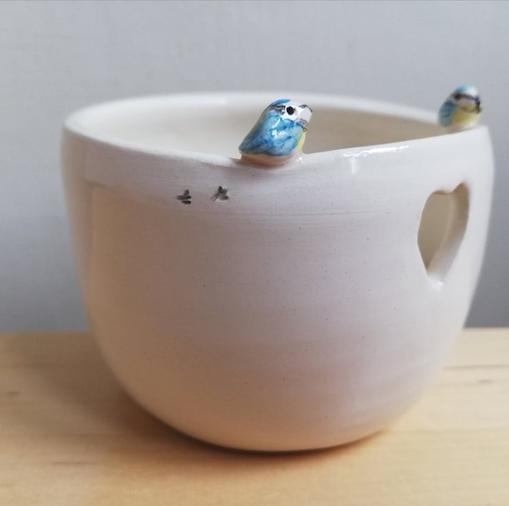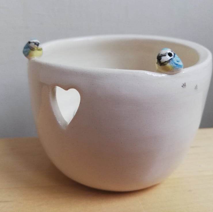 Hand thrown off the hump. Once trimmed and a heart was cut out, the handmade birds were attached and tiny foot prints added prior to bisque firing . The birds were then hand painted and the whole pot dipped in clear lead free glaze prior to the final firing.