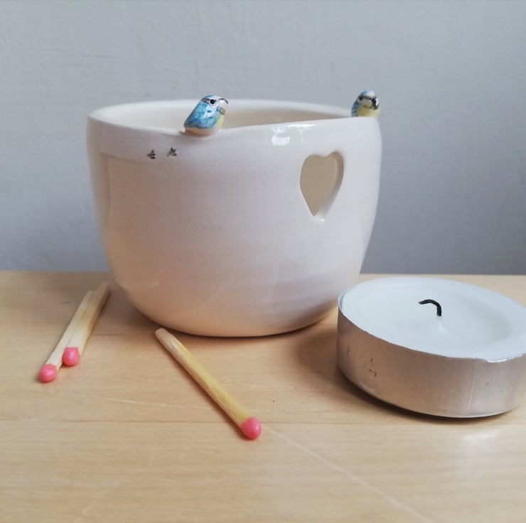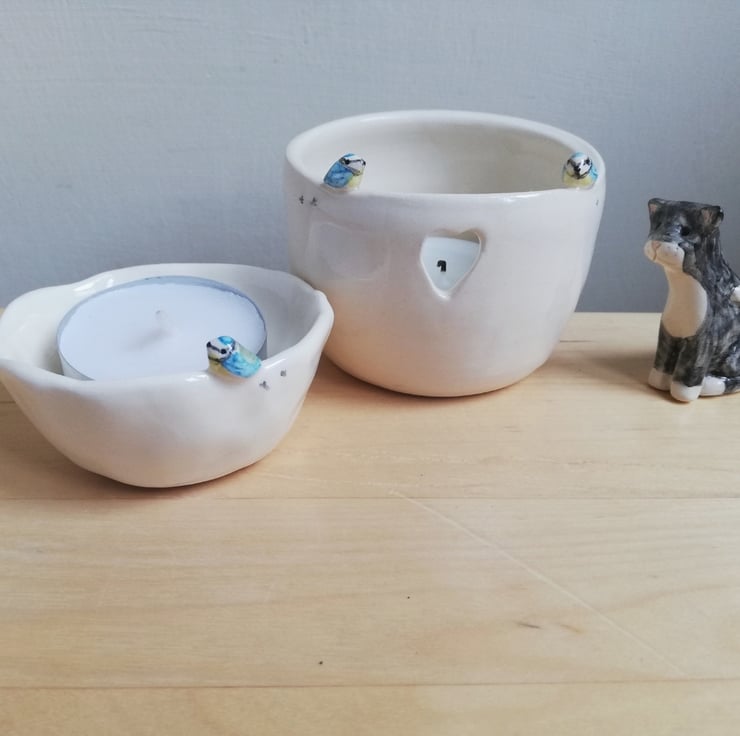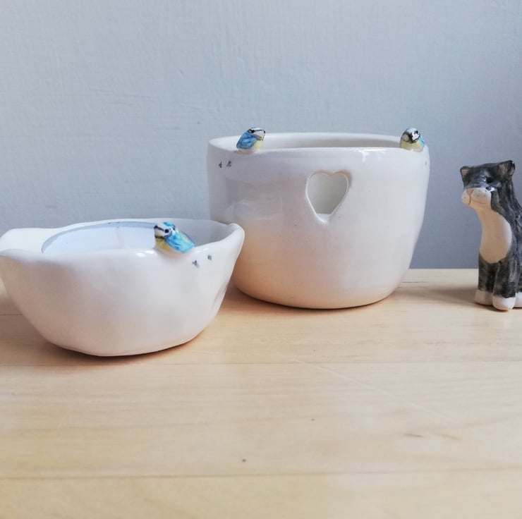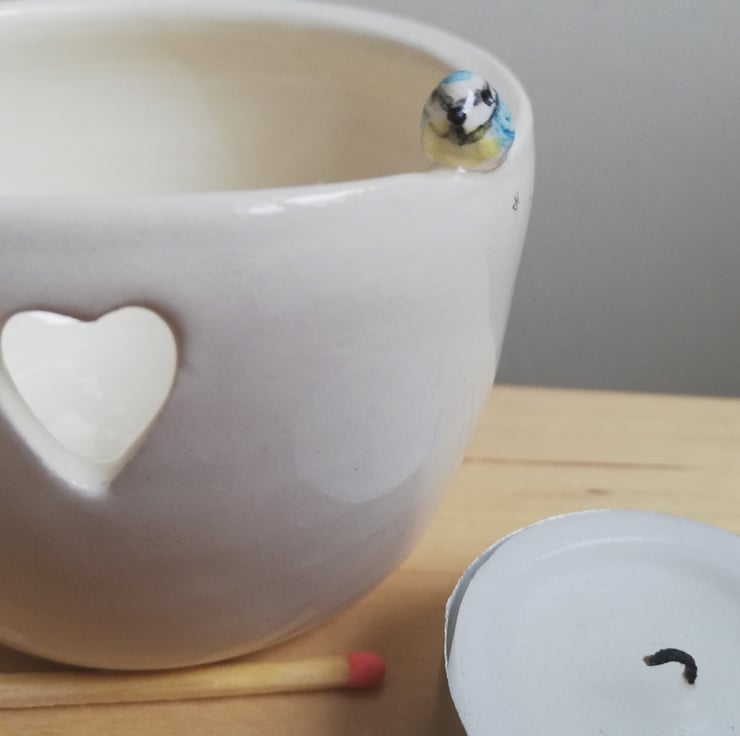 Pottery blue tit tea light candle holder. There are 2 hand modelled birds perched on the side and little footprints with a heart cut out and blue heart underneath in white clay and clear shiny glaze .