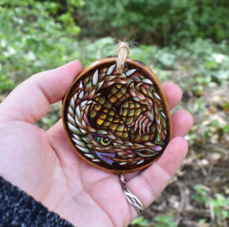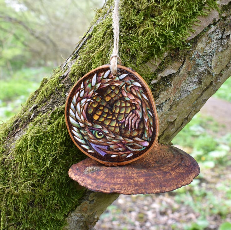 A beautiful wood burned decoration, featuring the a mother dragon coiled around a clutch of 4 eggs