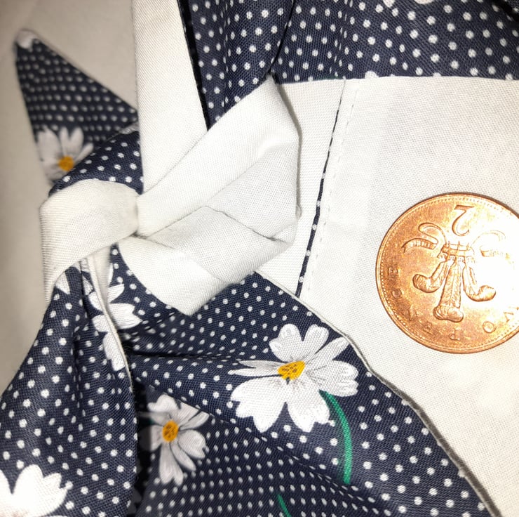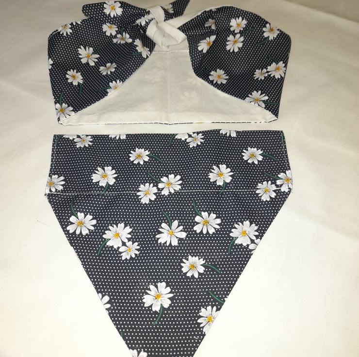 Handmade over the collar dog bandana, with a reversible shaped headband. Made with polycotton daisy print fabric. Dog bandana is in size Small or Large. Width being 6.5 for S and 8.5 for L.