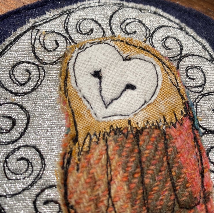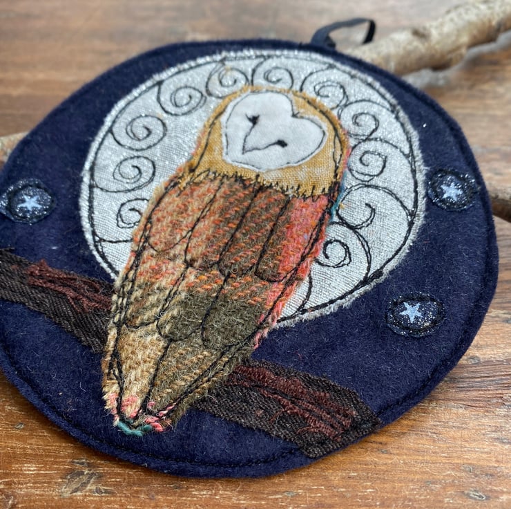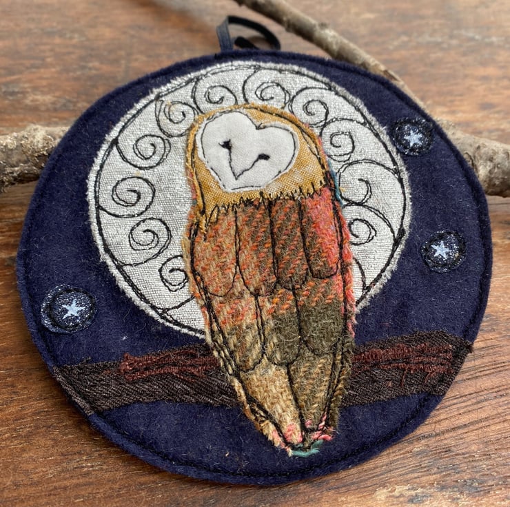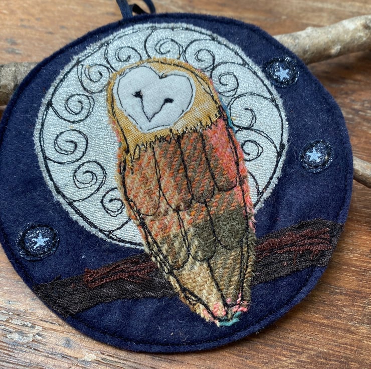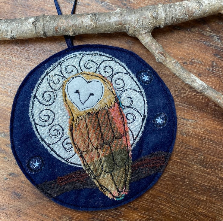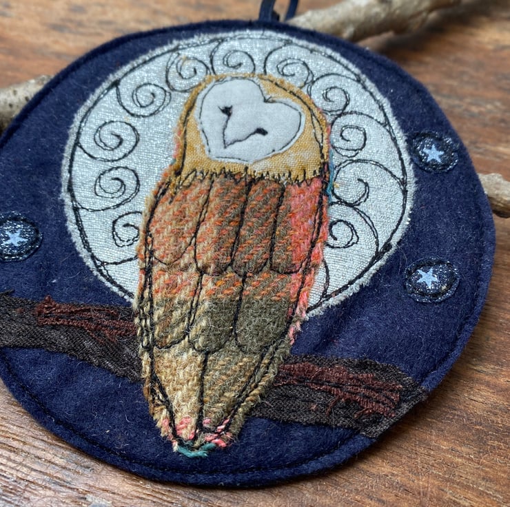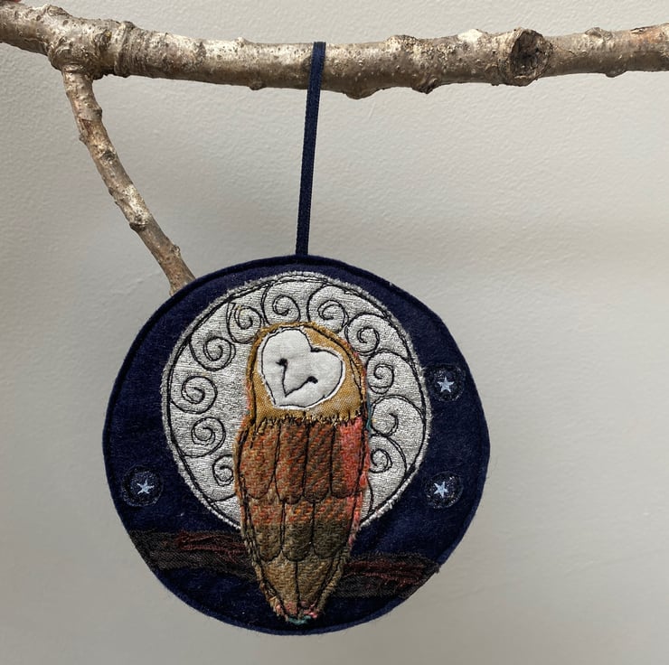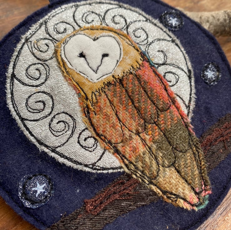This beautiful embroidered owl decoration has been made with up-cycled fabrics. The owl is framed by a starry sky and a silvery full moon, and is enhanced with free motion embroidery. It’s perfect for a season greetings, Christmas tree decoration, house warming gift or to decorate your home. It comes with a matching ribbon and is backed in felt. The decoration has diameter 9.5cm. With the ribbon it’s length is 18.5cm.