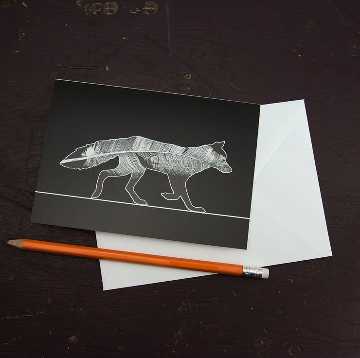 This Feather Fox greetings card is taken from the original glass design that had a white feather printed across it in homage to these wiley chicken raiders.
