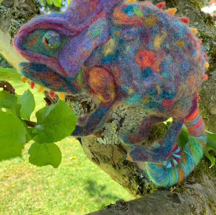 I gave myself a challenge to make something difficult, I am a self taught fibre artist and apart from loving the bright colours of a chameleon, I try to expand my felting abilities in each new project I make