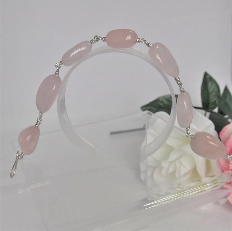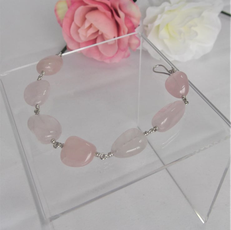 This chunky bracelet has been made using rose quartz drilled tumble stones and sterling silver wire.