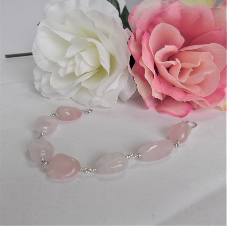 The rose quartz tumbles vary in size from approximately 15 mm to 20 mm. There is a wrapped loop at each end of the crystals made from sterling silver wire. The overall length of the bracelet is approximately 7.5 inches / 19 cm and it should fit the average adult female wrist.