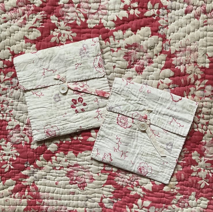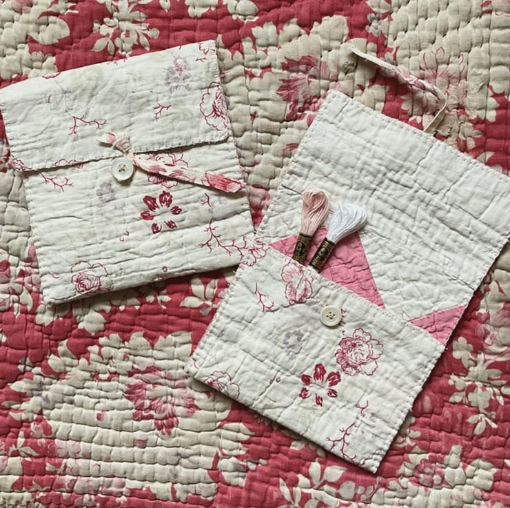 A gorgeous vintage quilt pouch, designed to hold your embroidery skeins. Lining of the floral quilt features a contrast patchwork in pink.