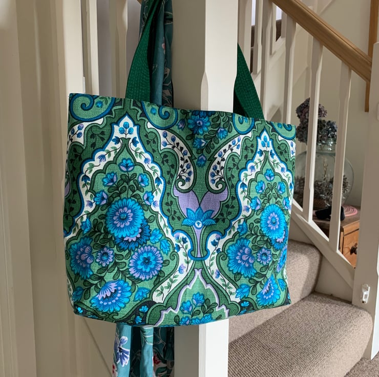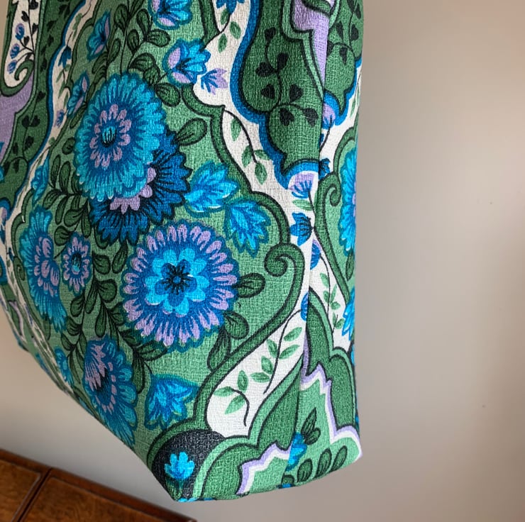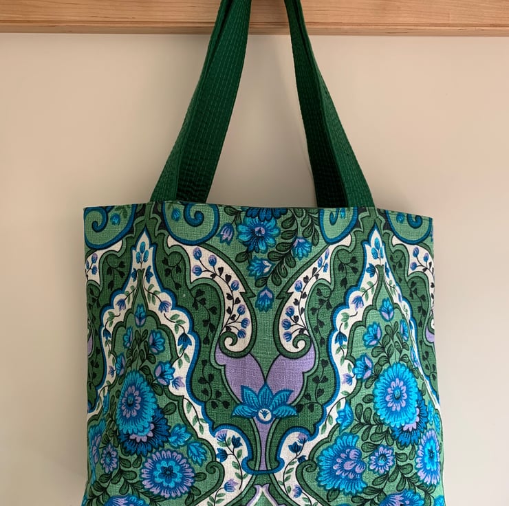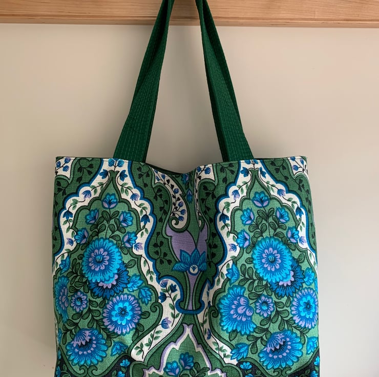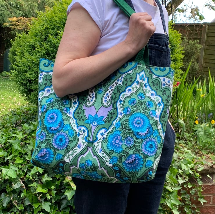 Striking retro design bark cloth tote bag. This colourful vintage print is in shades of green, blue and purple on a white background. The colours are really fresh and vivid.