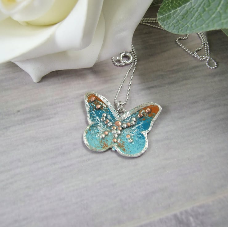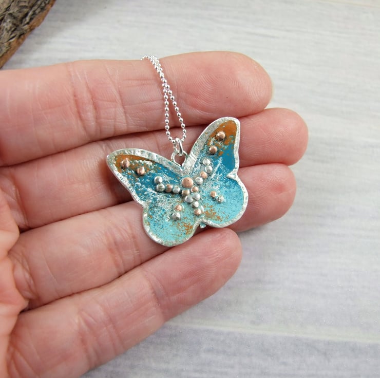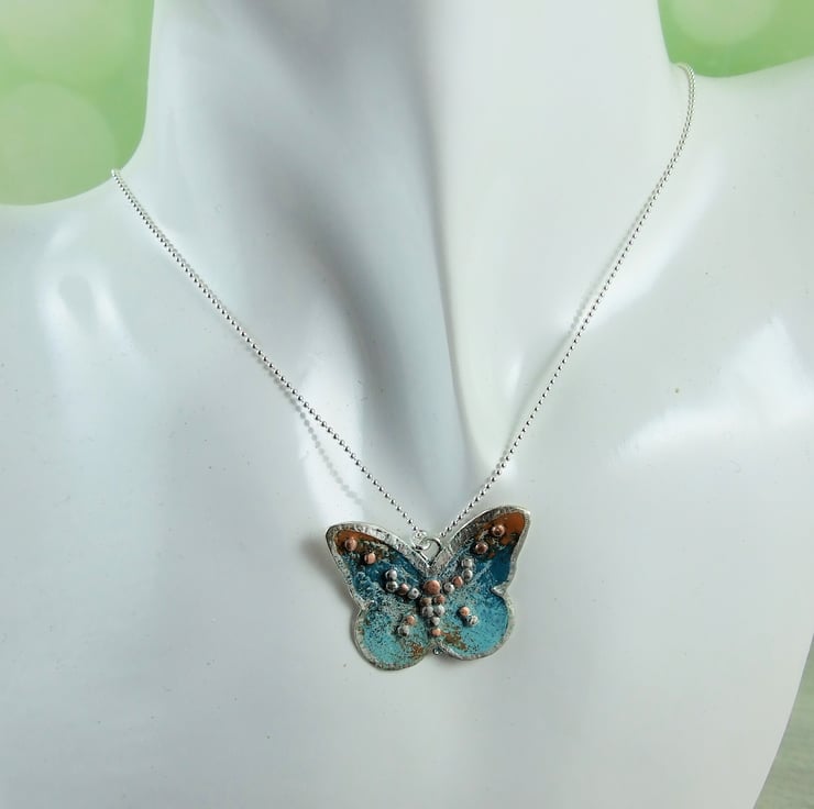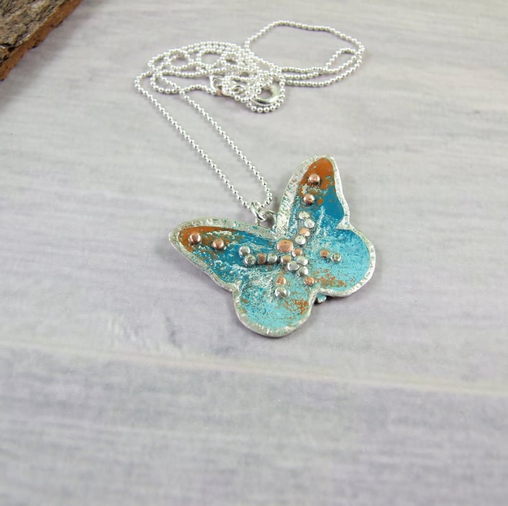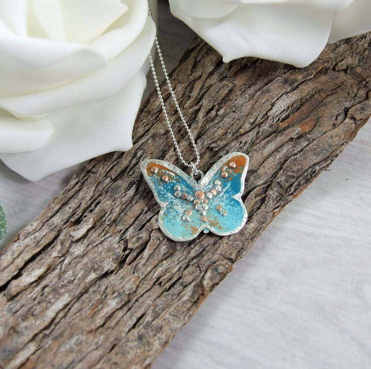The necklace is entirely handmade. I have cut the butterfly shape from sterling silver sheet then added a fine wire outline and little copper and silver beads to add texture all soldered in place then I have addded some colour with Efcolour low fire enamels in shades of vibrant orange and turquoise.