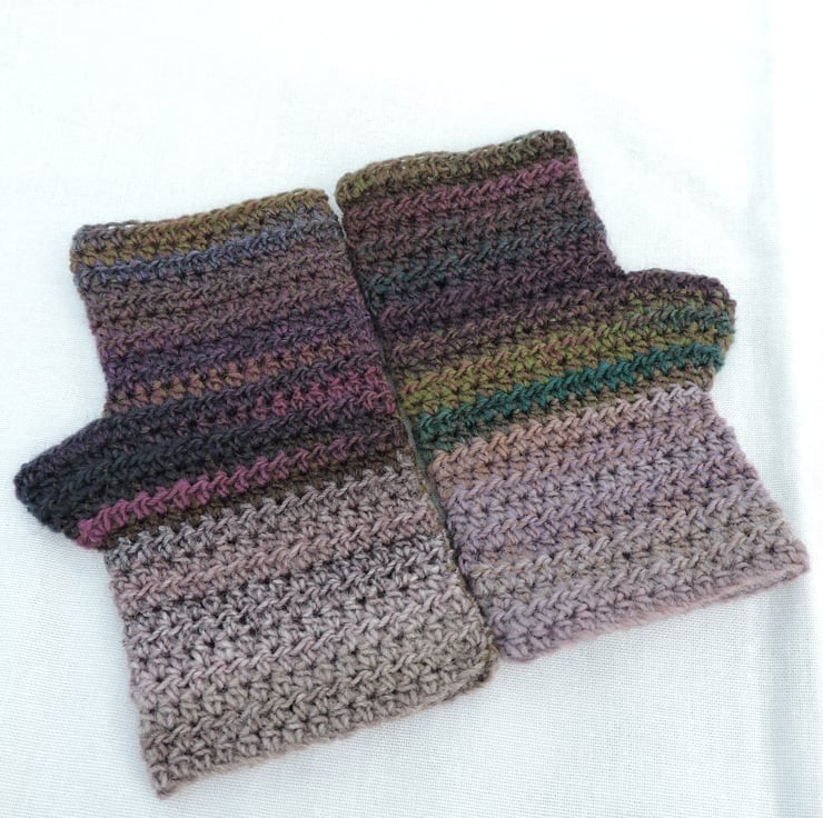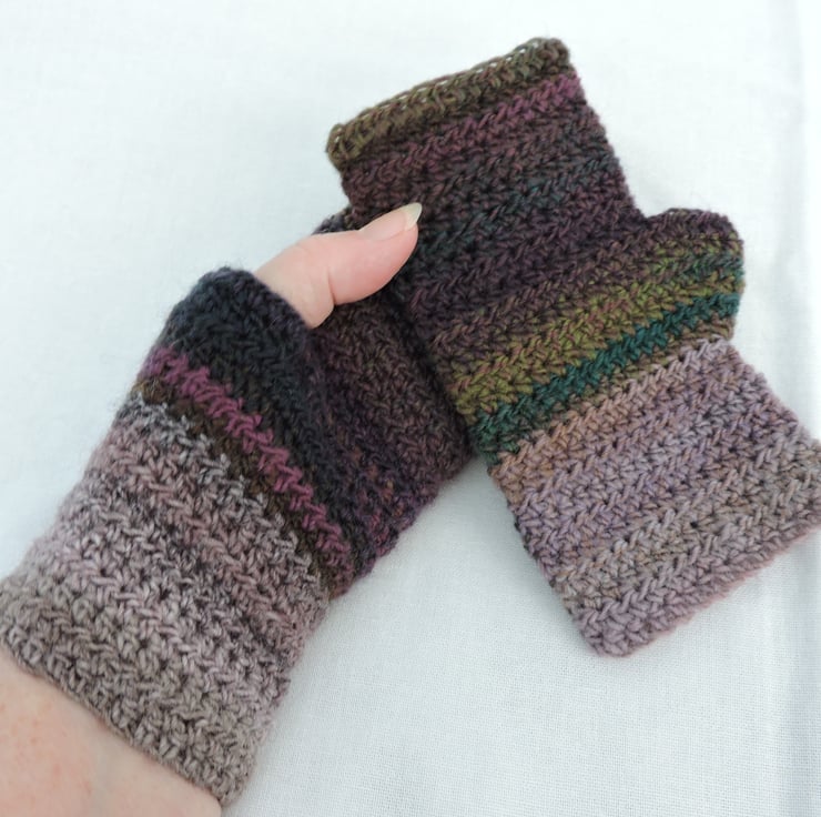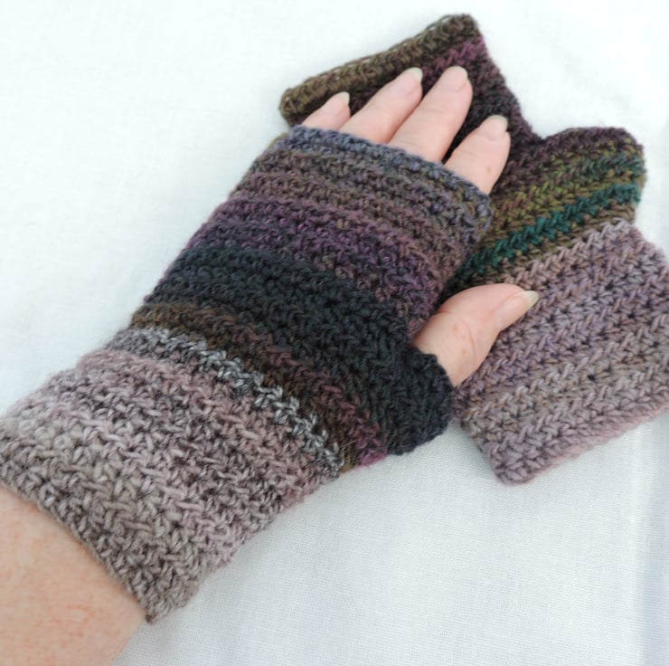 CLEARANCE SALE now £4.50 These crocheted fingerless mismatched mitts have been made with a wool and acrylic graduated self striping yarn. Co-ordinating forest colours of mauve, taupe, mushroom, magenta and green. The ideal warm winter warmer.