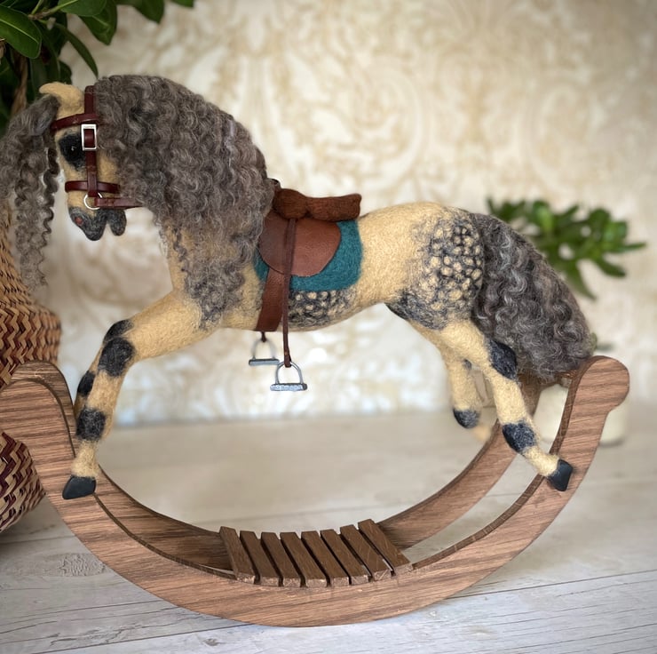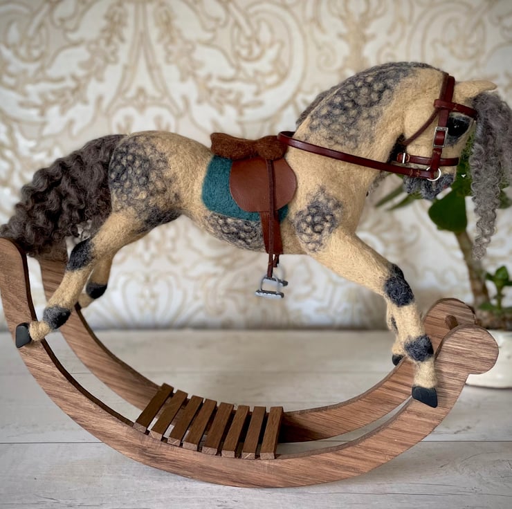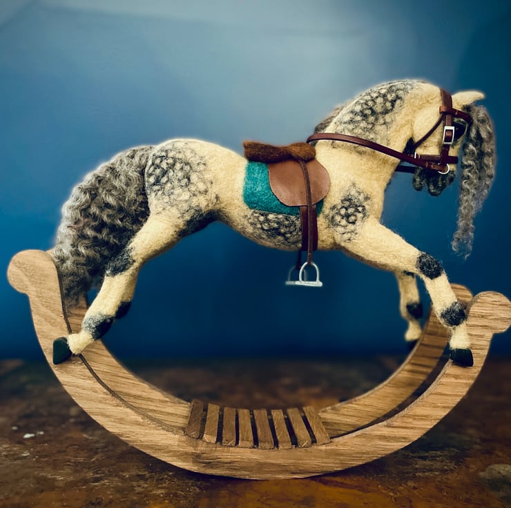 This is a one of a kind, handmade miniature, rocking horse. All my art pieces are designed on paper and then a wire armature is created before quality carded wool if felted on to create the form.