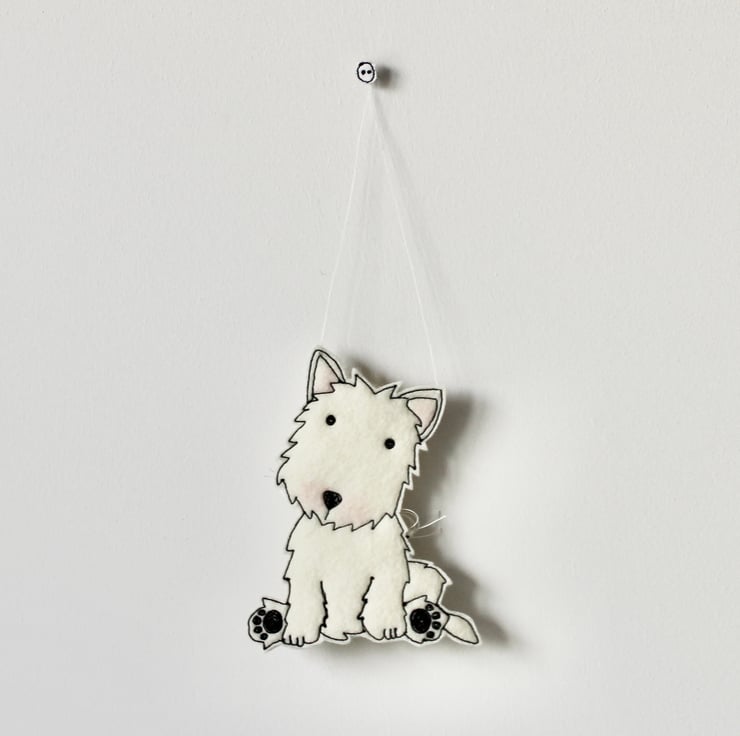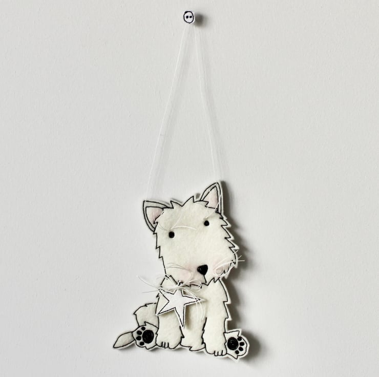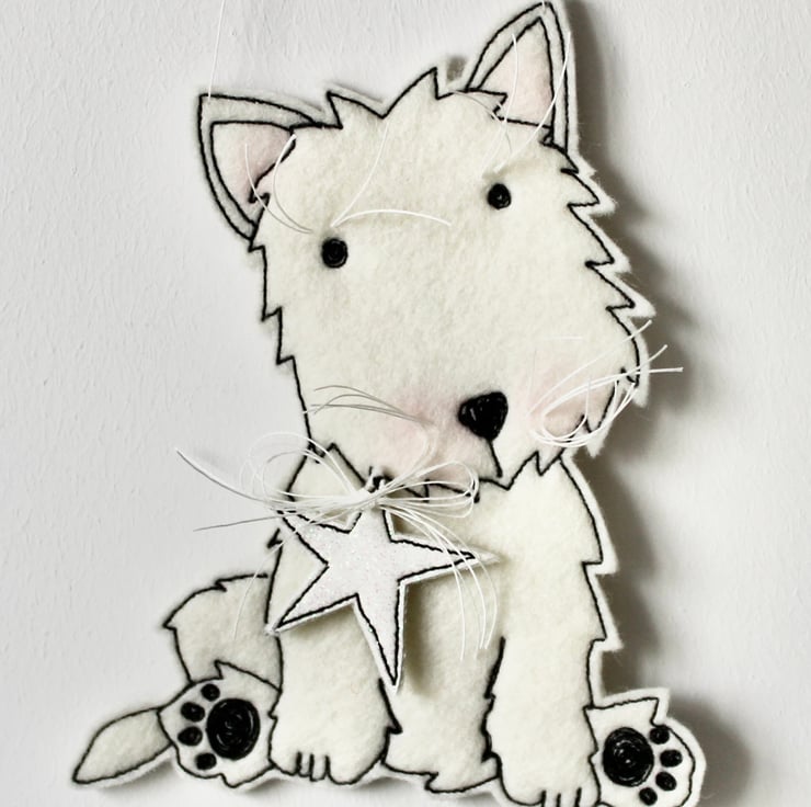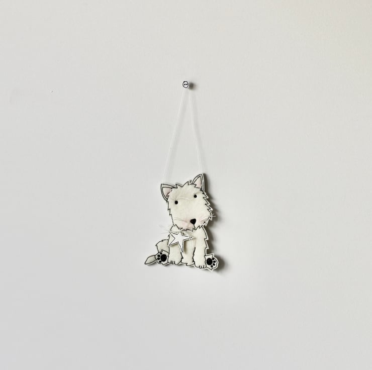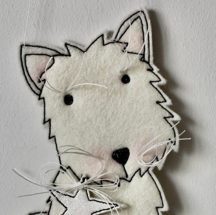 Little Puppy is created using 100% wool felt, glitter cloth, free hand machine embroidery and is cut out by hand using very sharp scissors. With a linen string to suspend.