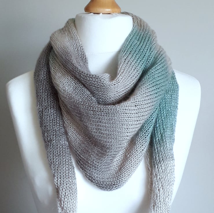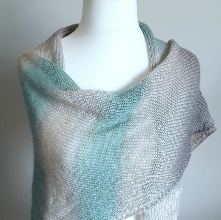 This triangular shawl is beautifully soft and light, but with 10% Alpaca wool content it is also cosy and warm. It has been lovingly knitted on a hand operated knitting machine using a beautifully soft blend of alpaca and acrylic yarn in gentle tones of green, cream and grey.