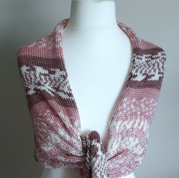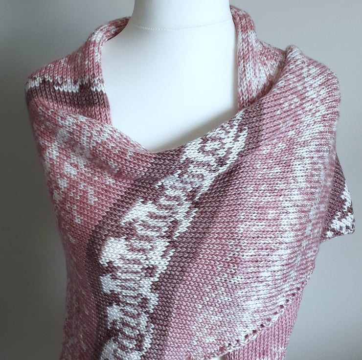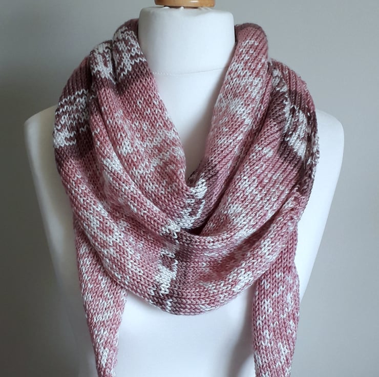 This triangular wrap has been lovingly knitted on a hand operated knitting machine in beautifully soft pink and cream acrylic yarn. It will make a much loved addition to your wardrobe or a wonderful gift.