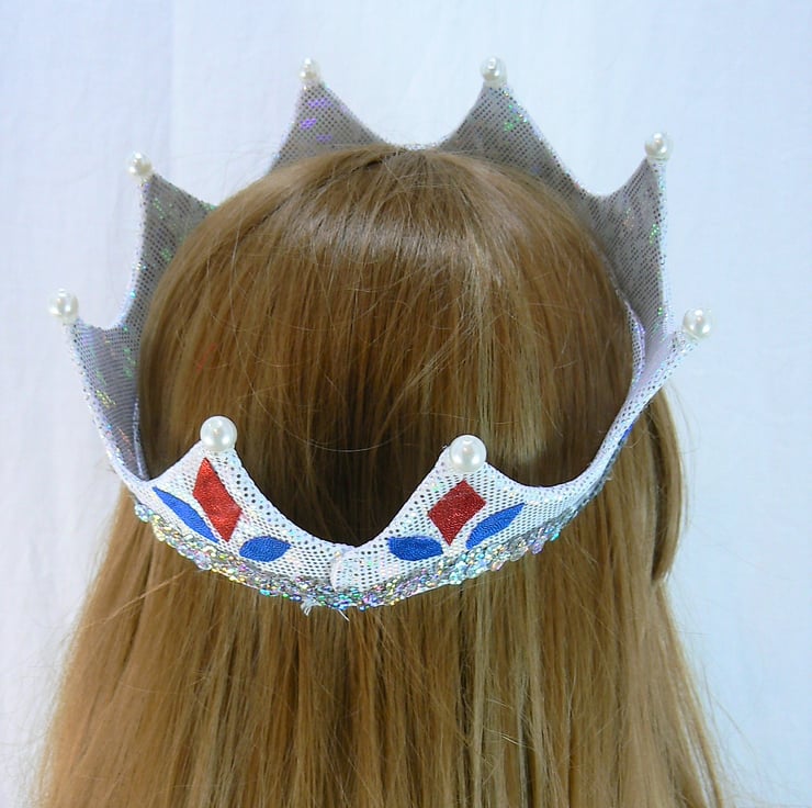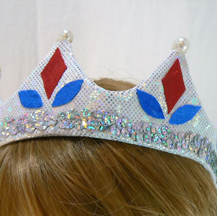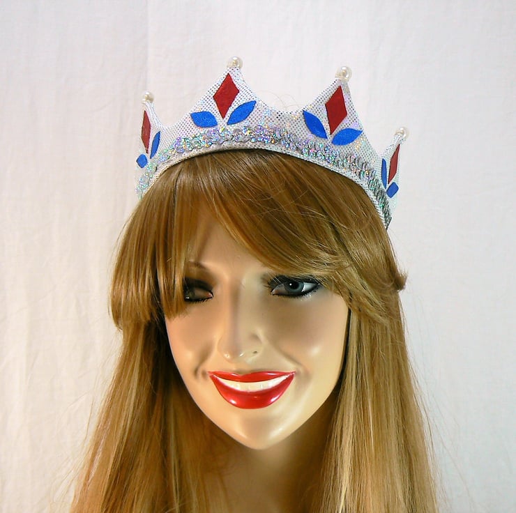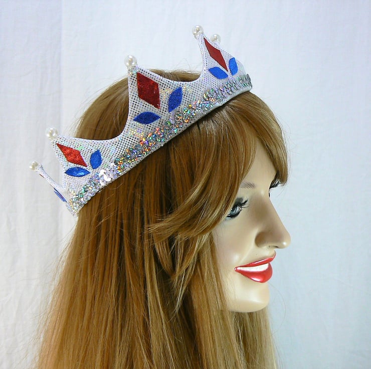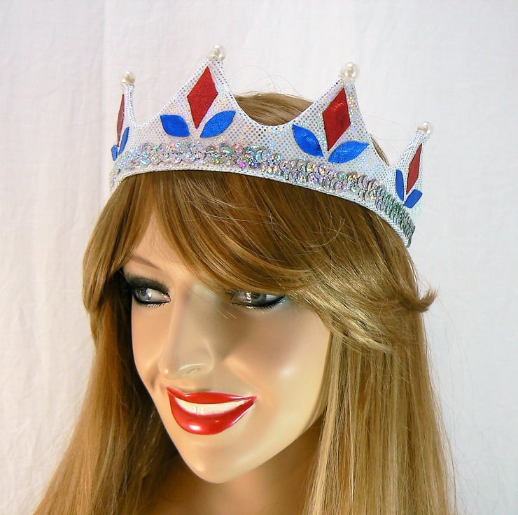 This silver hologram crown has a buckram base and is decorated with shiny red and royal blue shapes. The points of the crown tips are topped with large faux pearl beads, and has a row of silver hologram sequins around the bottom edge.