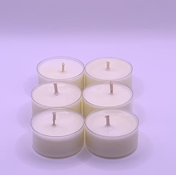 There are 6 tealights in this collection and have not been dyed. These tea lights contain approximately 15g and burn for approximately 4–6 hours.