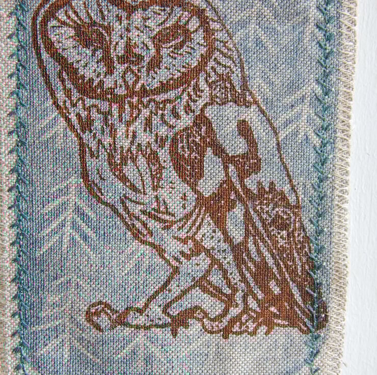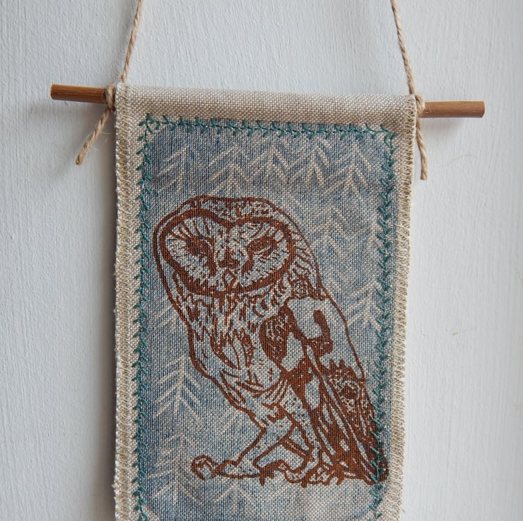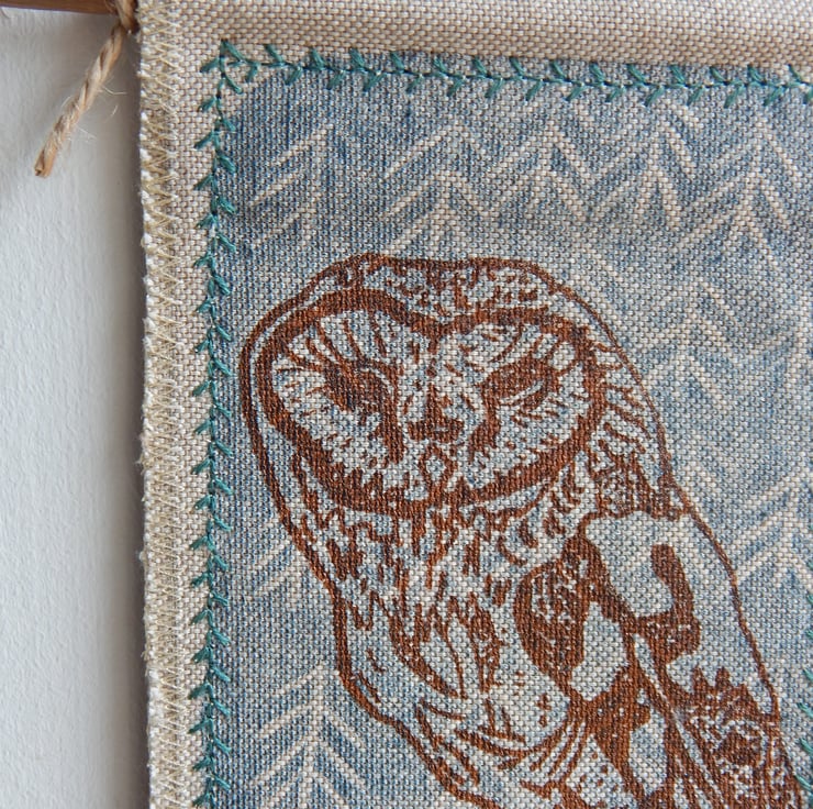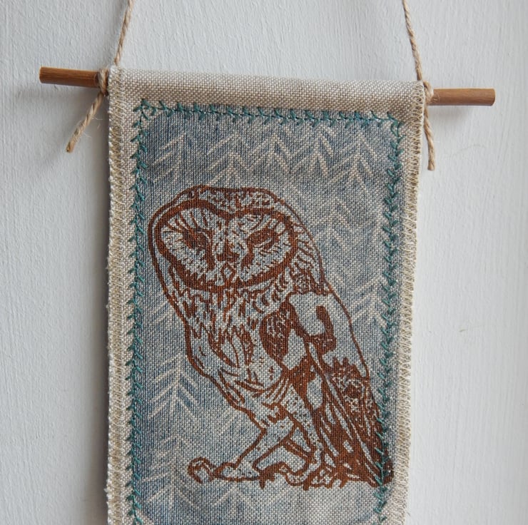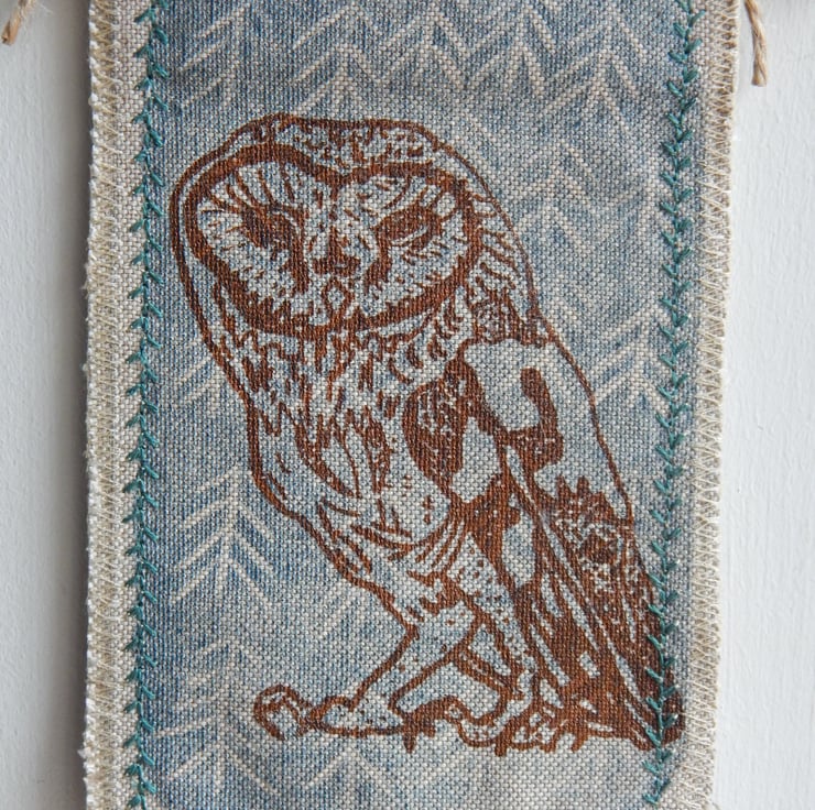 This is a screen printed barn owl, on a simple midnight blue lino print background. This has a couple of layers of cotton fabric for some stability and this is sewn onto a piece of willow, a simple hanging loop is made with a piece of hemp string connected from one end of the willow to the other.