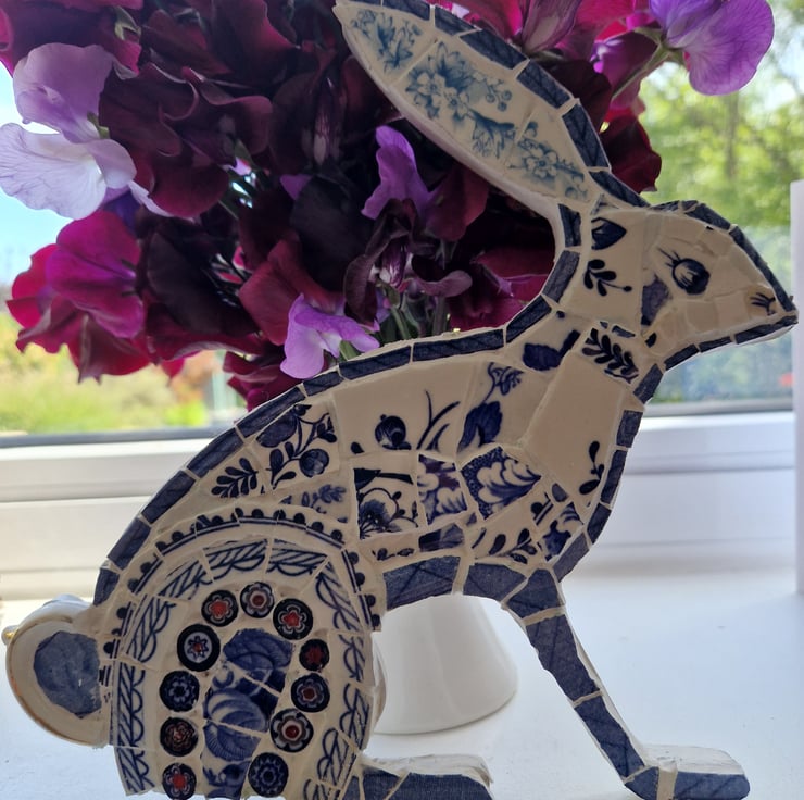 Blue and white china mosaic hare, handmade by me! Standing at 20cm tall, this hare comes ready to hang with command strips, or tp stand against something on a shelf maybe...