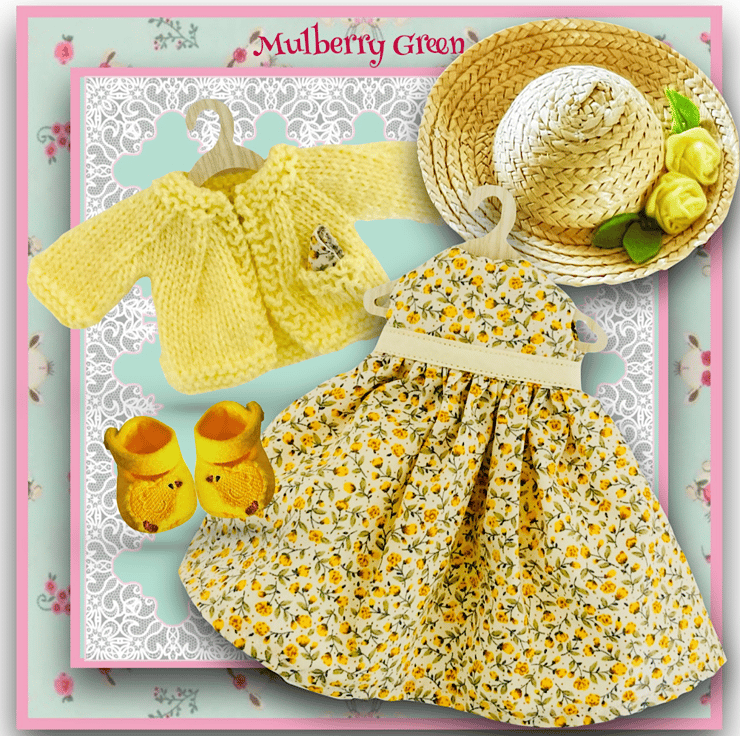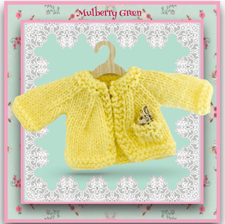 A pretty little lemon pocket cardigan to fit the Mulberry Green dolls. The cardigan has a cute little handkerchief in the pocket. It matches the lemon sprig dress.