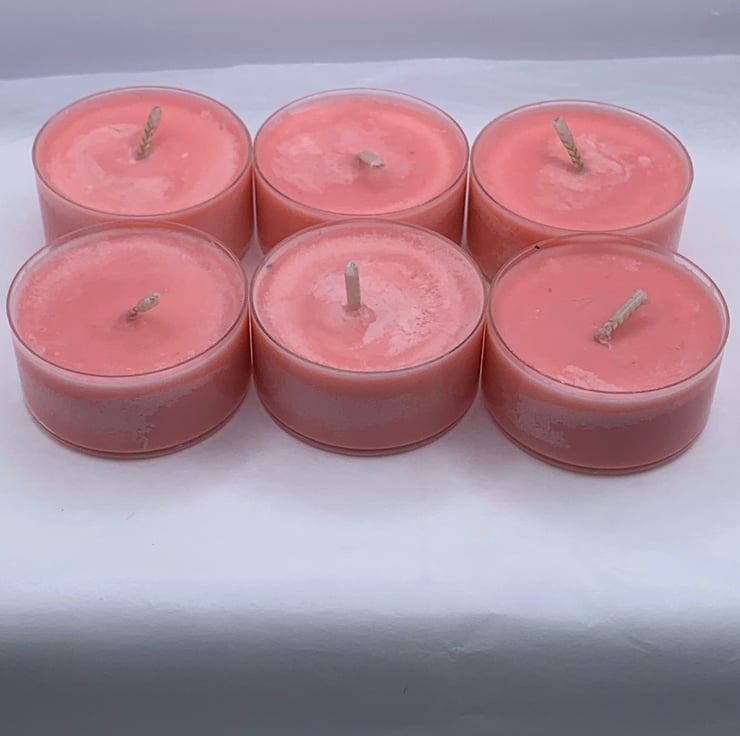 These tea lights are made of 100% soy wax and are medium scented with magnolia essential oil. Magnolia are large fragrant white star shaped flowers, that have a sweet floral scent with fruity notes. These tealights have been dyed best described peach/pink colour may look between orange and red.