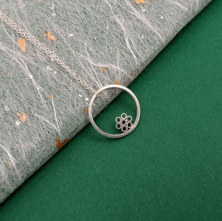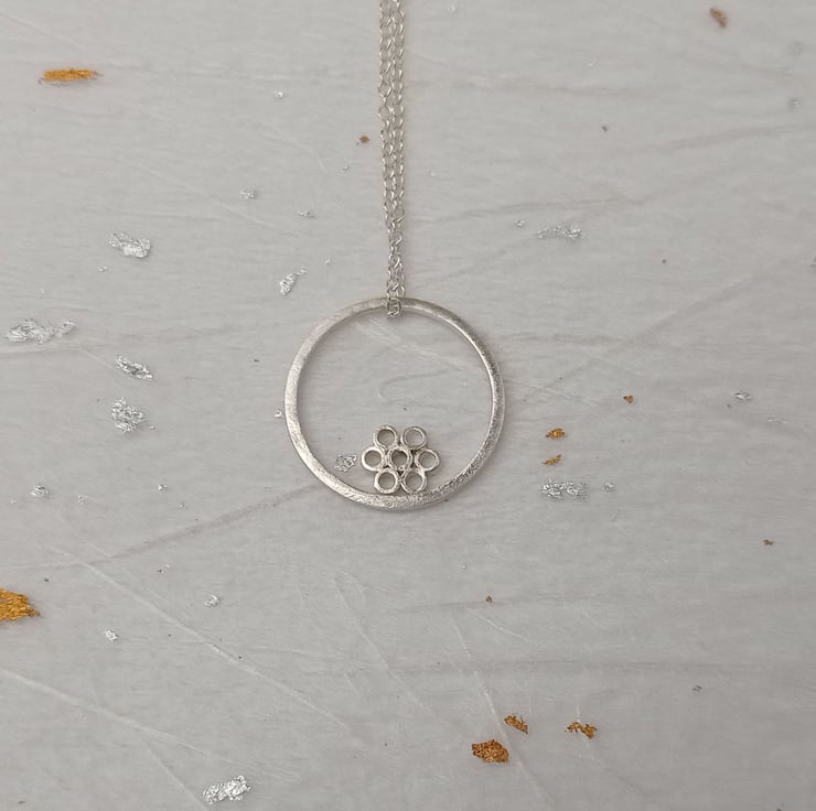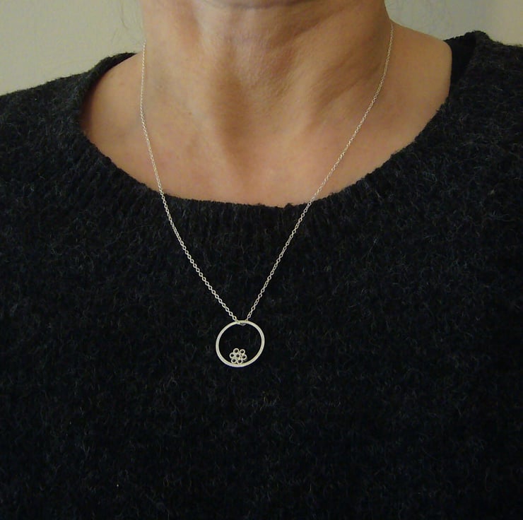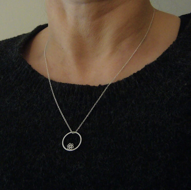 I have created this necklace by using recycled sterling silver square wire and tube. The tiny tubes have been soldered together to create a flower shape, soldered inside the wire circle, then given a brushed wire finish. It is part of a small collection of similar necklaces and earrings.