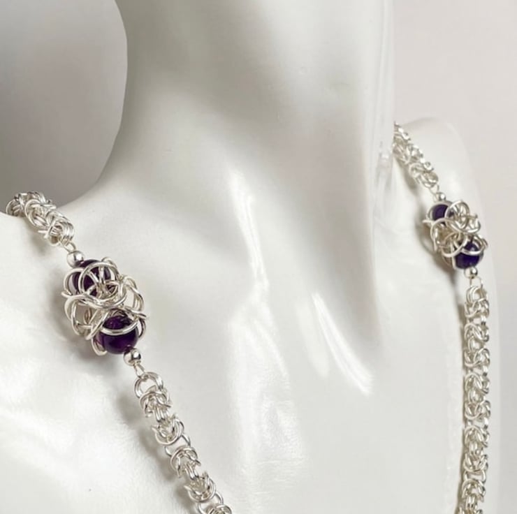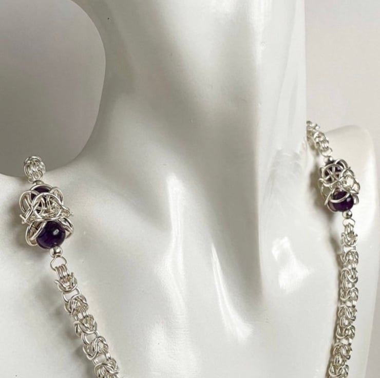 This necklace is a beautiful one of a kind item of jewellery that incorporates deep purple amethyst gemstones with chainmaille which has been made with sterling silver rings.