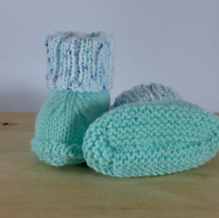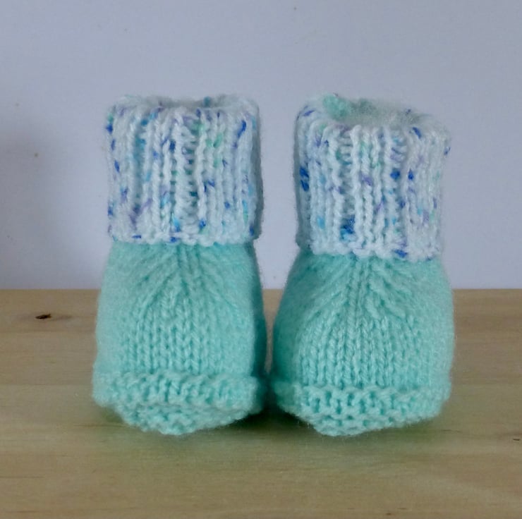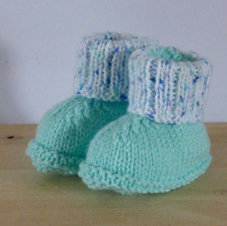 A pair of hand knitted Baby Booties in acrylic yarns. The foot of the booties are in a mint green yarn and the turn down top is in a white yarn with green and blue flecks. They measure approximately 4.5" from heel to toe with plenty of stretch.