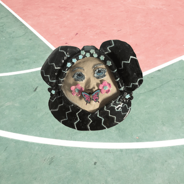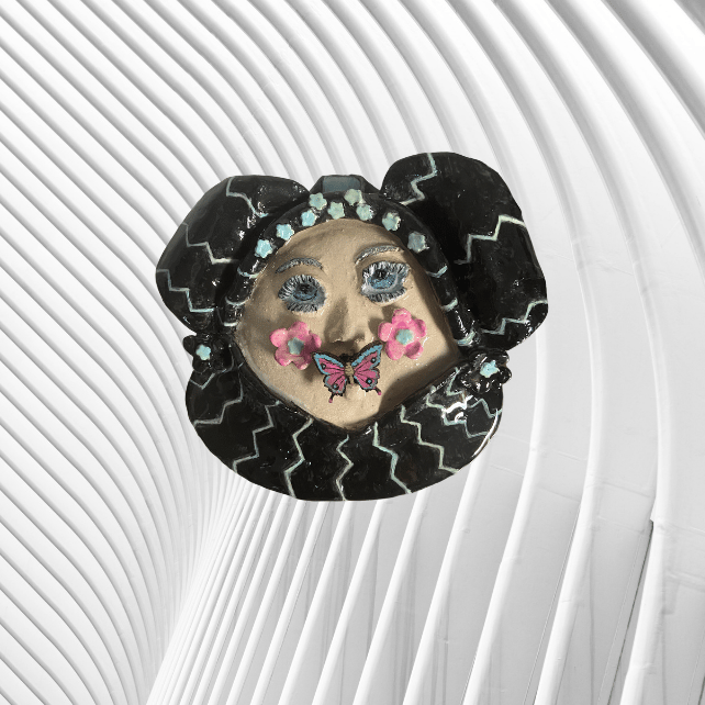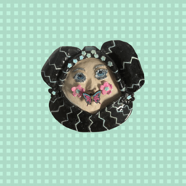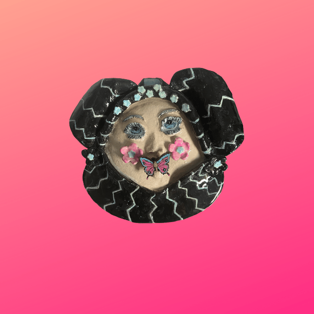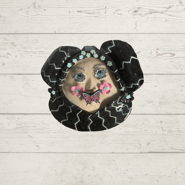 Handmade 3D Ceramic Funny Face Wall Plaque with a wooden butterfly turquoise and pink in her mouth.