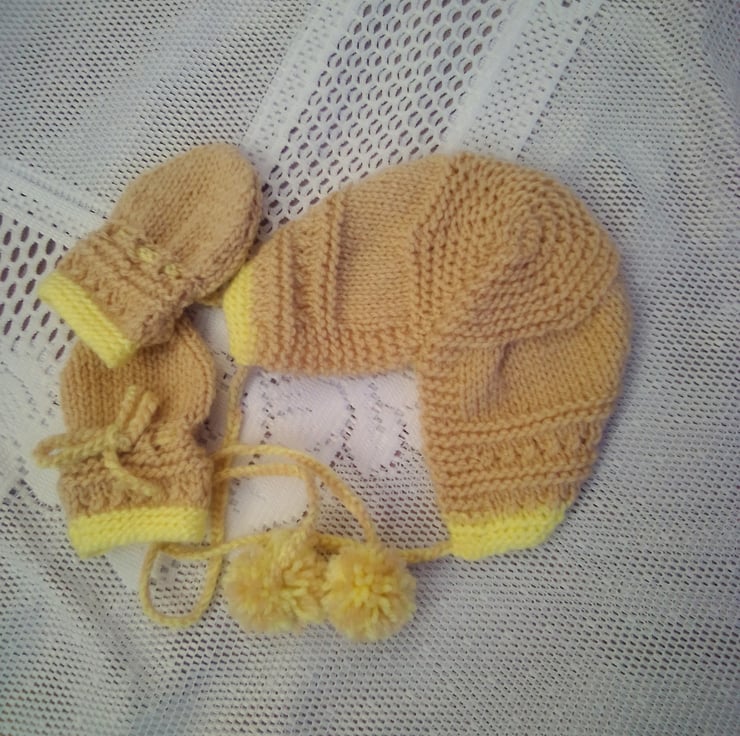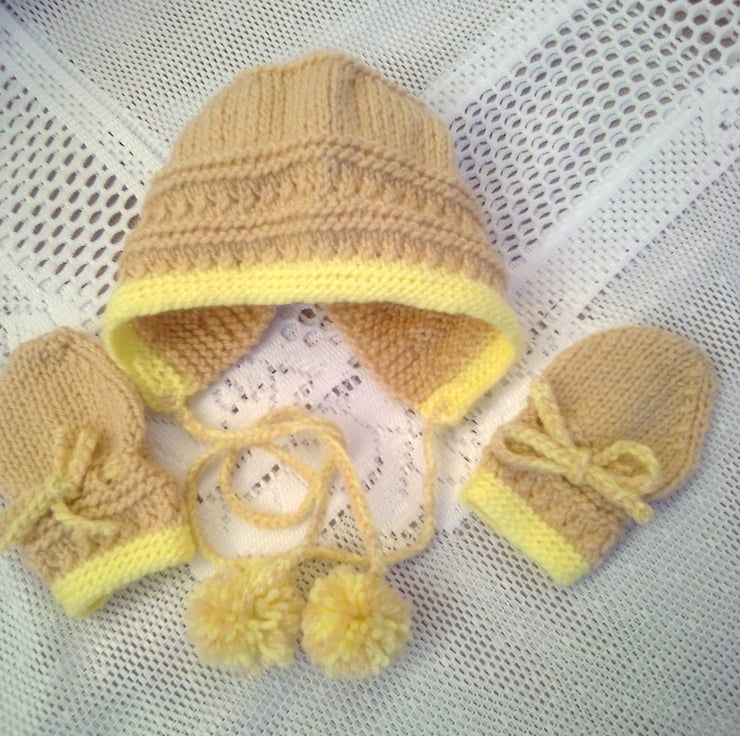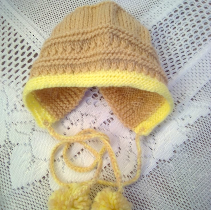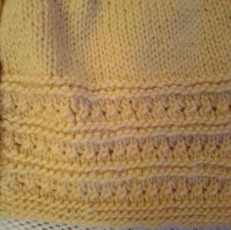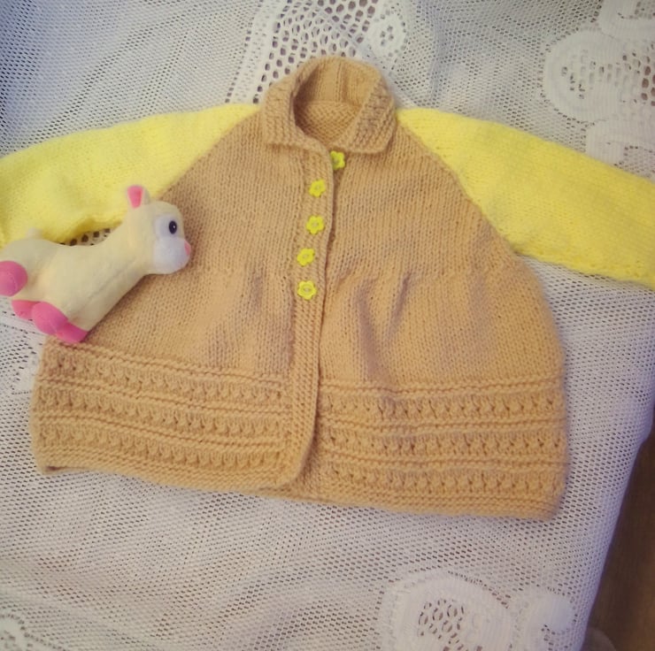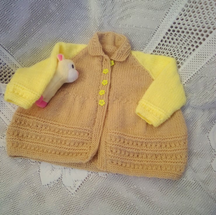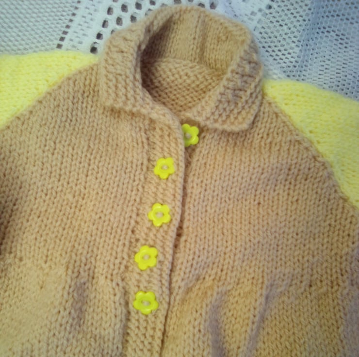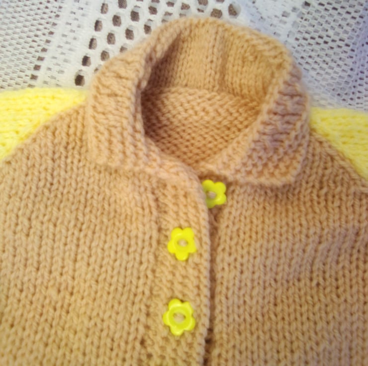 This gorgeous cardigan set is in stock in a size to fit a 0 - 3 month old baby with a 16 inch chest, in the biscuit and yellow shades shown in the photos. The layette can also be made in the size and colour of your choice (most colours are available), please see below for sizes available and state colour required when you order. The processing time will be 1 - 2 weeks to produce and post to you. It would make an ideal gift for a new born baby, a baby shower or as a Christening gift.
