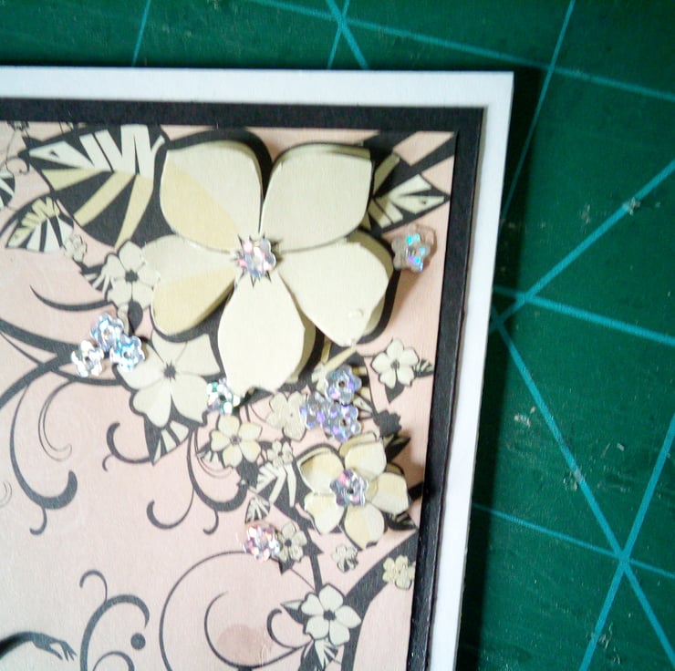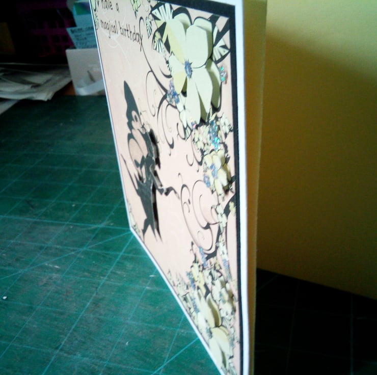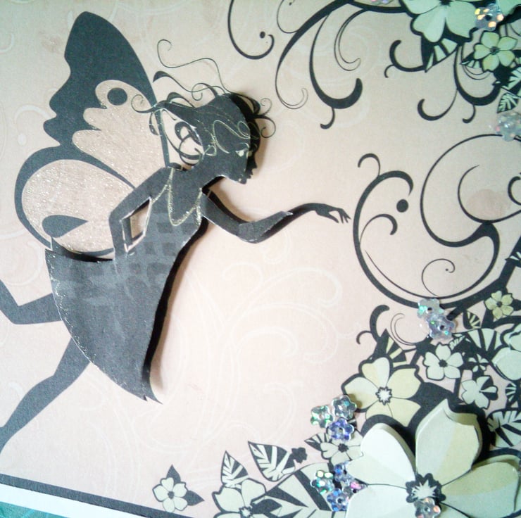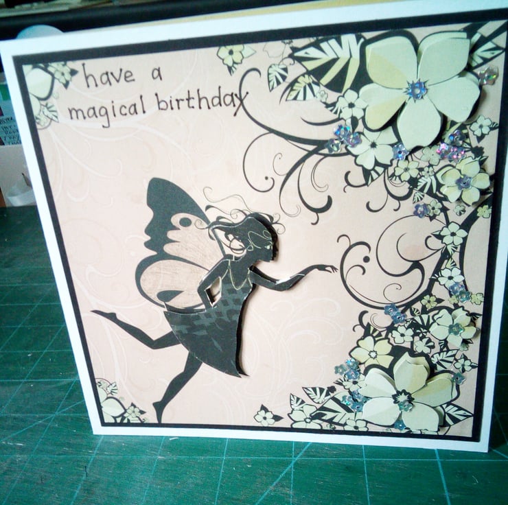 A completely handmade and uniquely designed card. Consisting of a fairy decoupage mounted onto floral fantasy card. Silver flower sequins adorn the flowers. Mounted onto black then pristine white quality card. Finished off with have a magical birthday handwritten in black ink