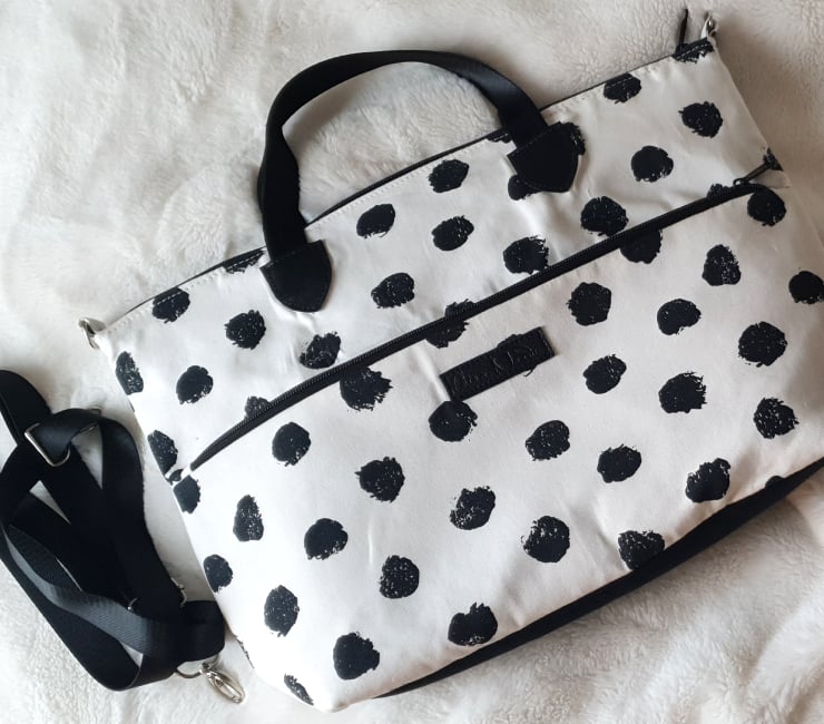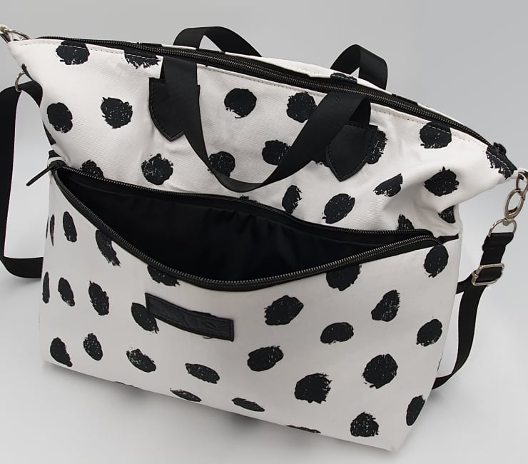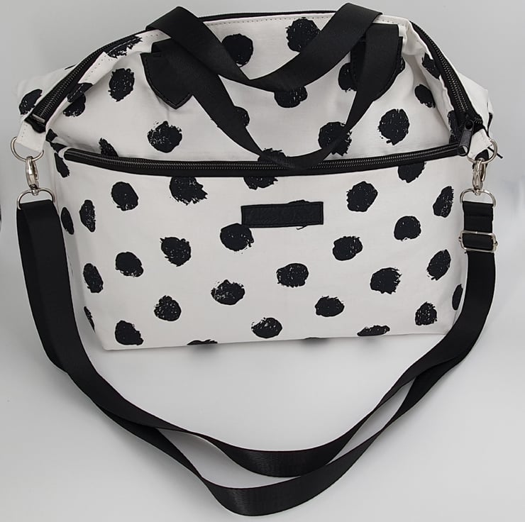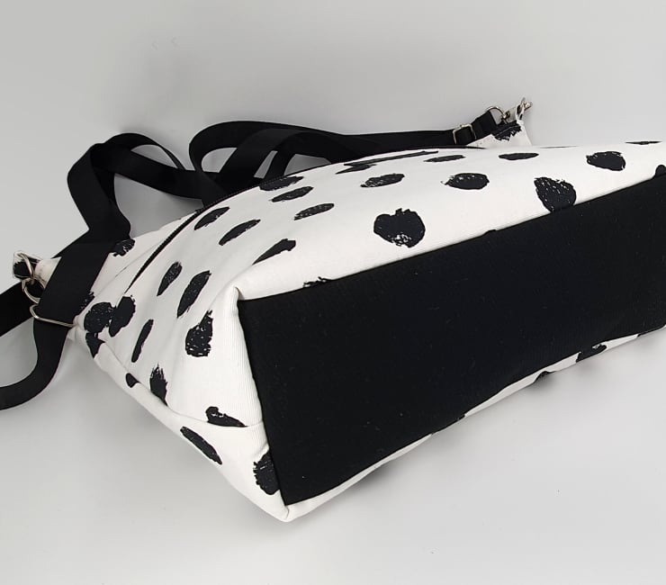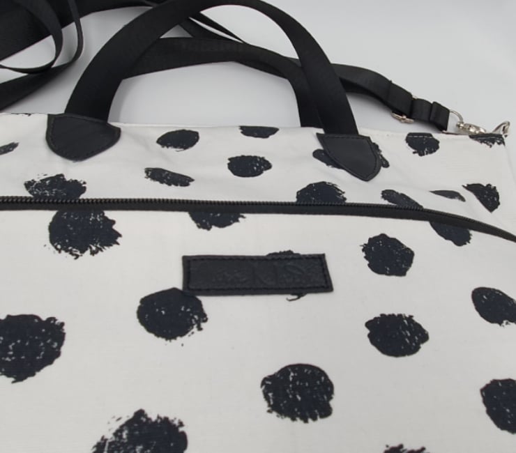 Oversized polka dot, cotton canvas tote with leather trim (triangle patches holding the handles).