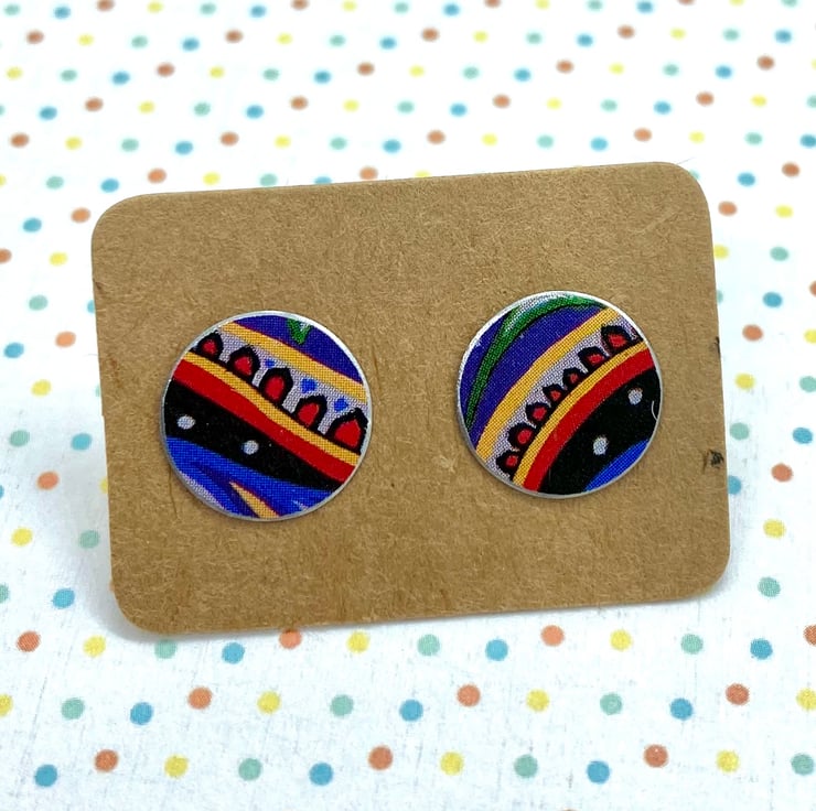 These little discs have been hand cut from a colourful vintage tin and smoothed around the edges. They feature a vibrant pattern of red, blue, black and yellow. A great way to add a pop of colour!