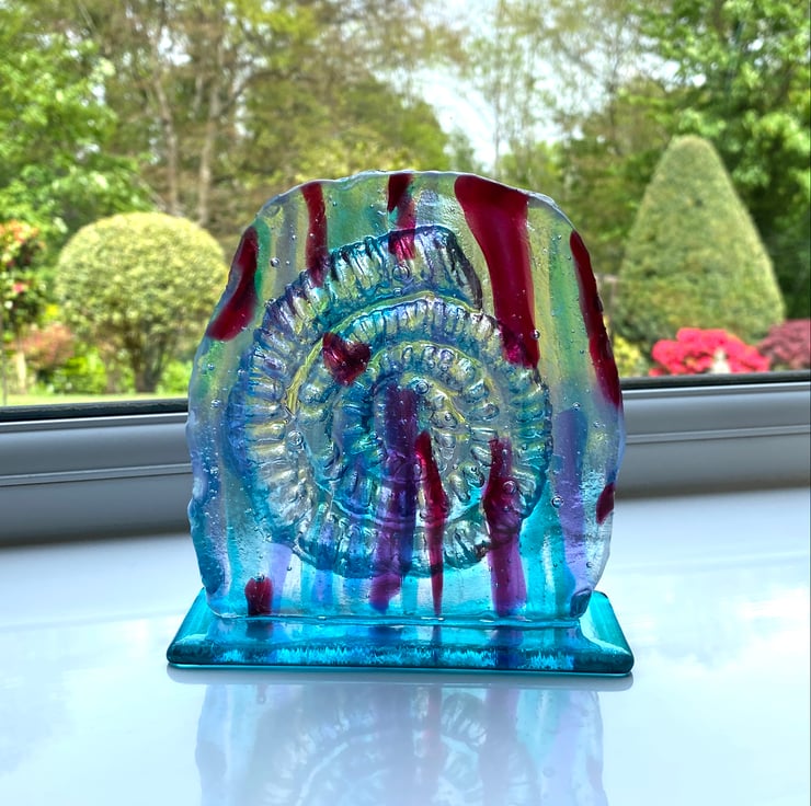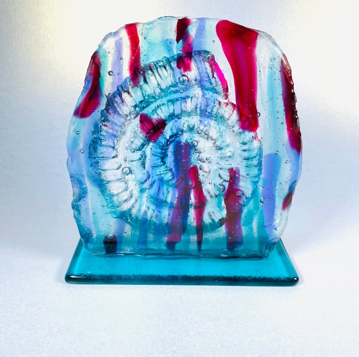 I loved creating this piece ! I made a mild form a real ammonite then cast various coloured and clear glass strips into it and firing in the kiln . It stands aproximately 5 inches high and 5 inches wide and has a natural edge . Pink and turquoise glass were used in this sculpture to add to the textural feel of the piece . The piece sits on a flat turquoise glass base . This is one of a kind