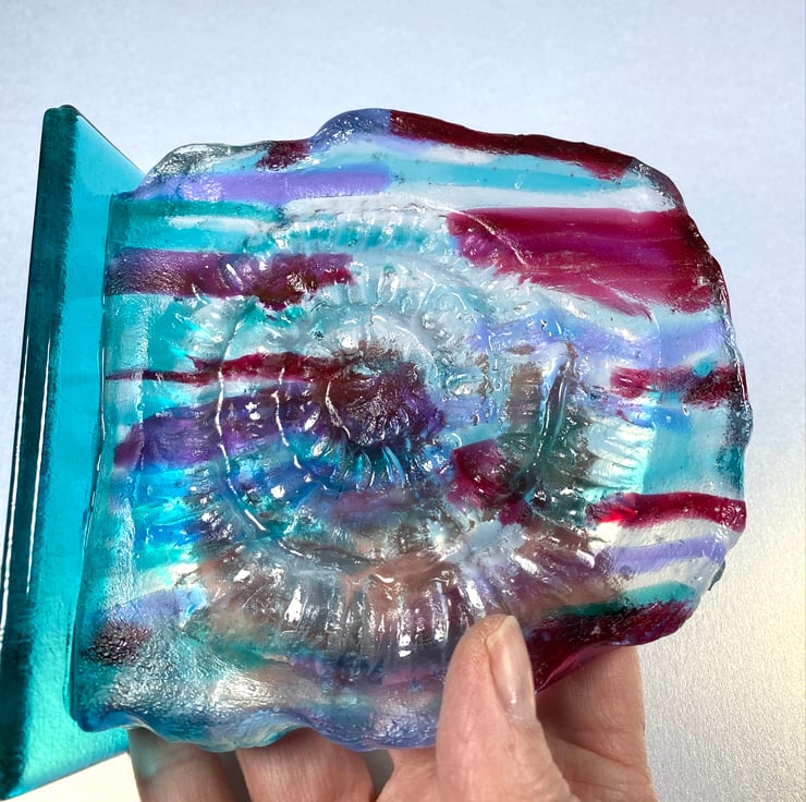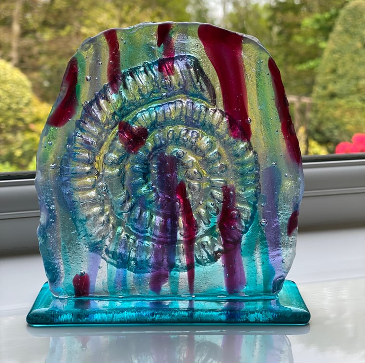I loved creating this piece ! I made a mild form a real ammonite then cast various coloured and clear glass strips into it and firing in the kiln . It stands aproximately 5 inches high and 5 inches wide and has a natural edge . Pink and turquoise glass were used in this sculpture to add to the textural feel of the piece . The piece sits on a flat turquoise glass base . This is one of a kind