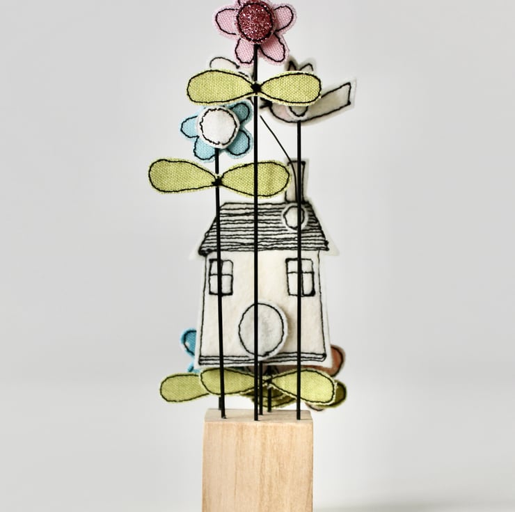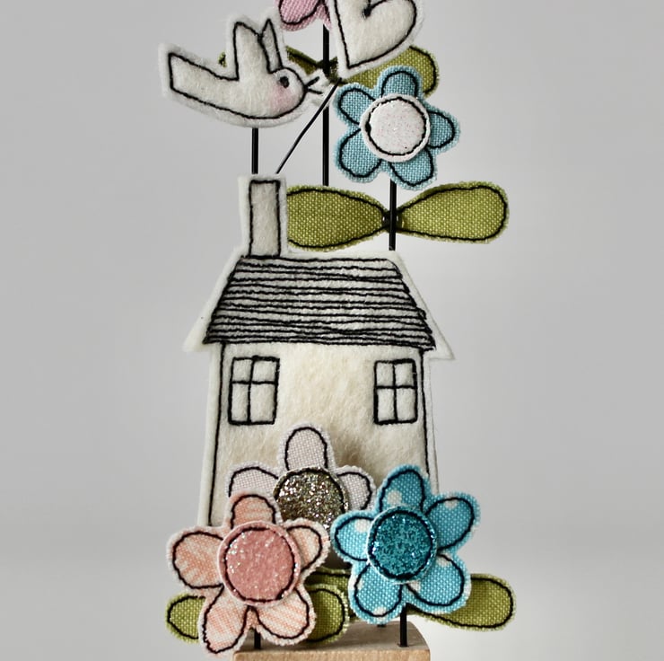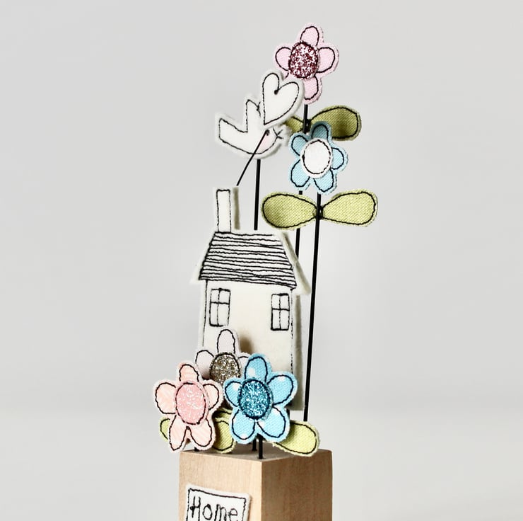 The house, flowers, birdie, heart and 'home' label are sewn using 100% wool felt, cotton cloth, glitter cloth and free hand machine embroidery; multiple layers of cloth are sewn together and cut out by hand using sharp scissors. Mounted on a 3cm cube wooden block which can adorn a mantle piece or any flat surface.