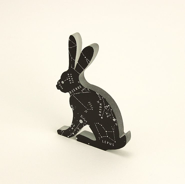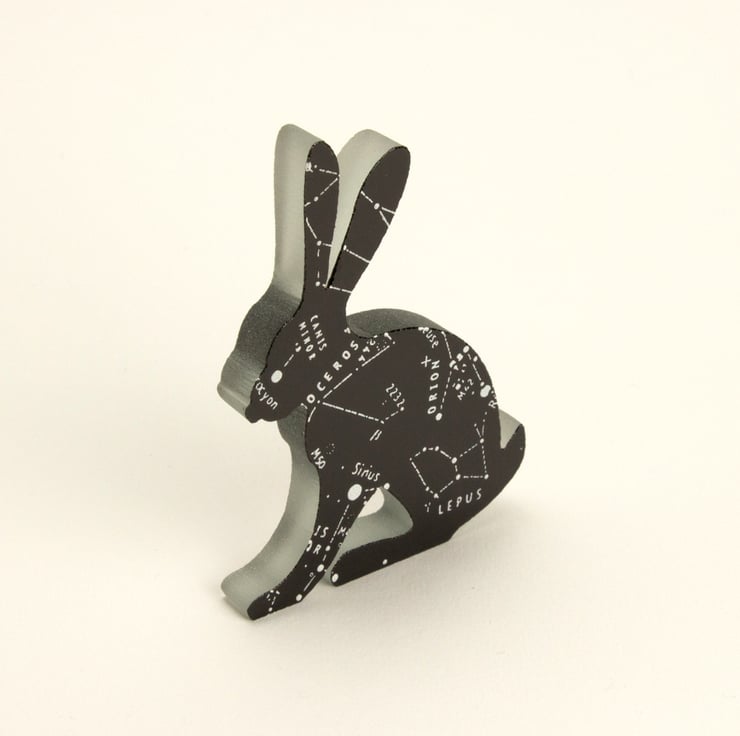 Capturing the nightsky, with the constellation of lepus and the surrounding star systems onto this hare outline. The black and white enamel also reacts to create a raised surface where they meet which adds a lovely texture to this piece.