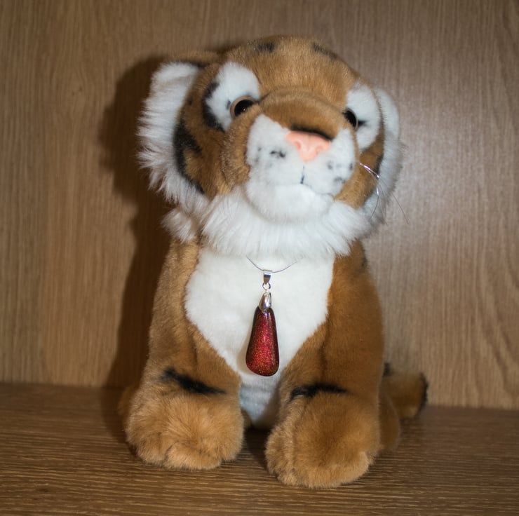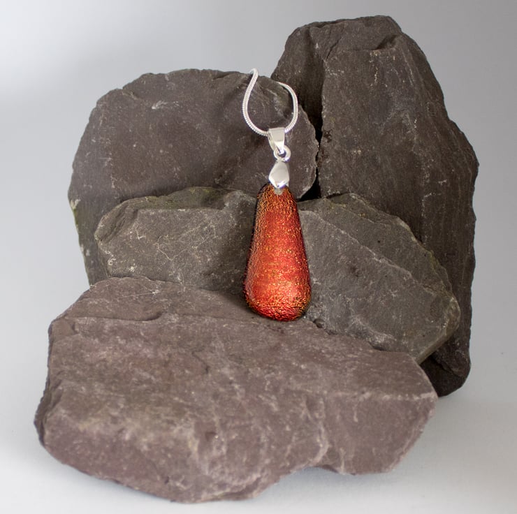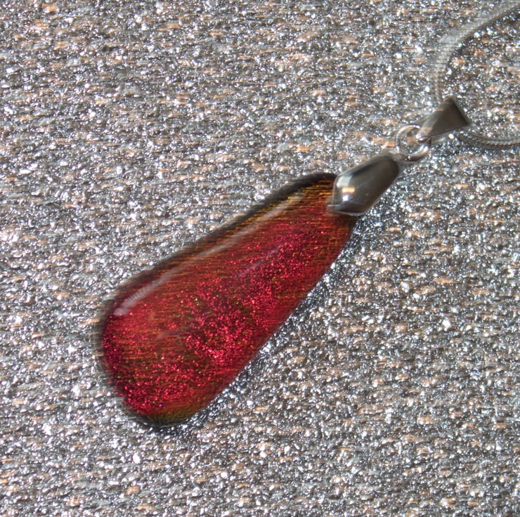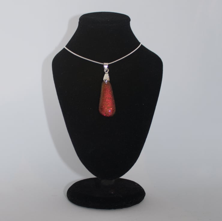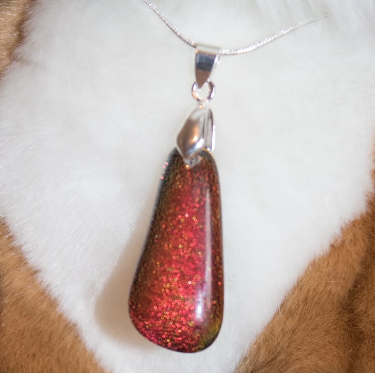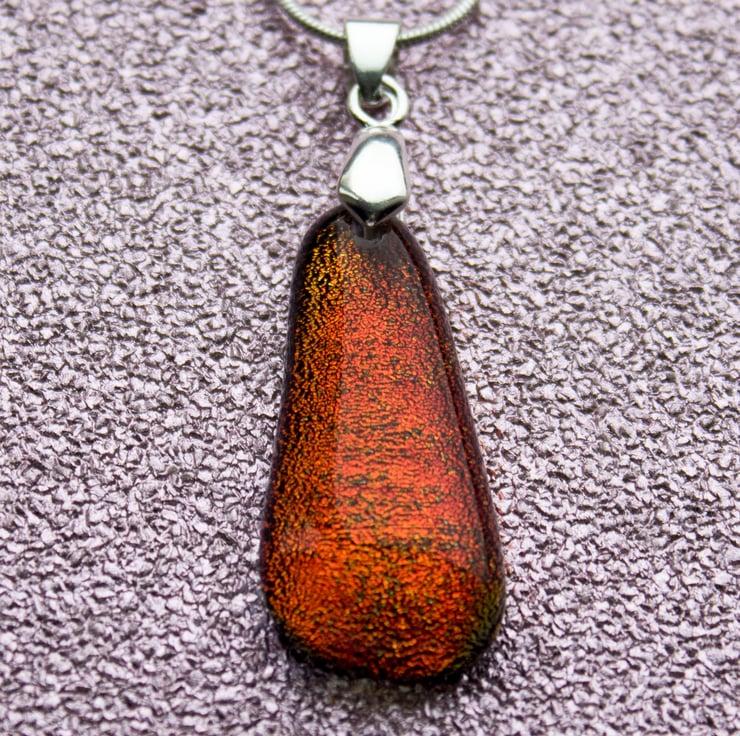 The shape is hand-cut from a single piece of dichroic glass which has been capped with a similarly shaped piece of clear glass. It is approximately 3 cm tall and 1.5 cm at its widest and is strung from an 18-inch silver snake chain.