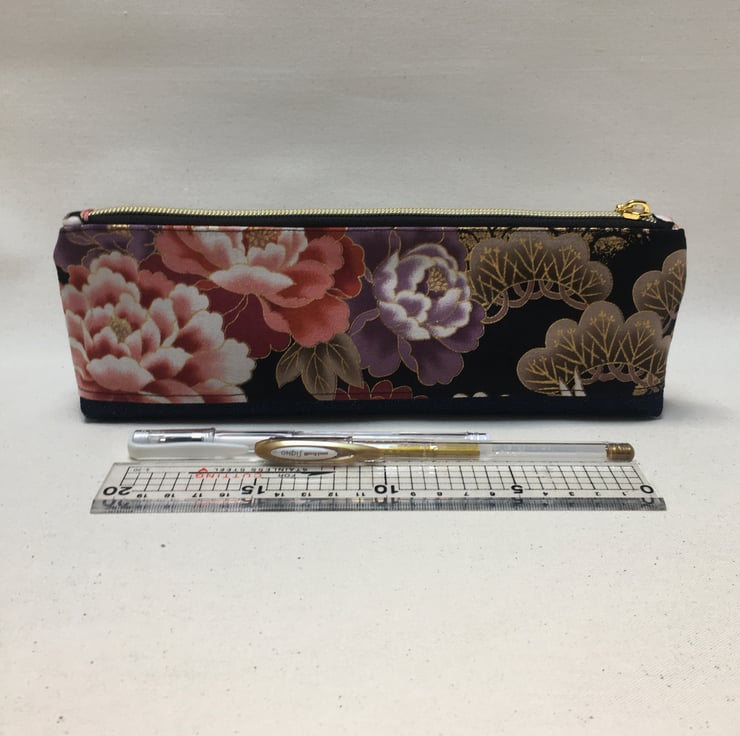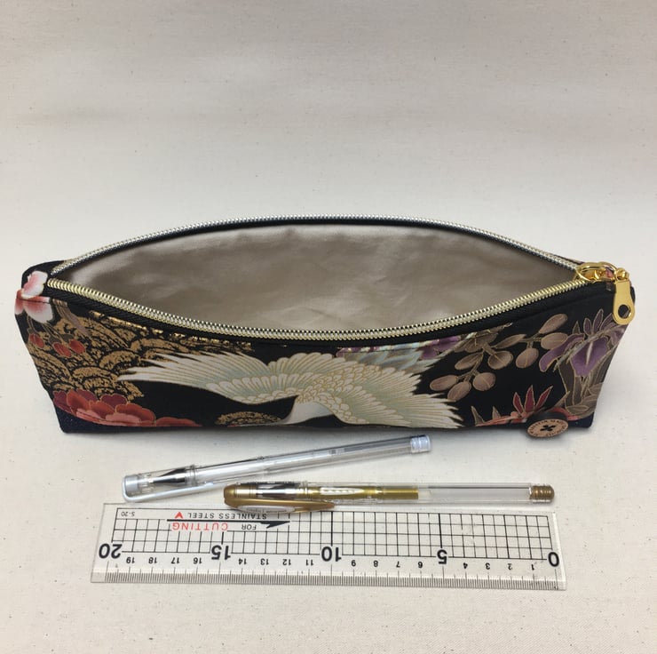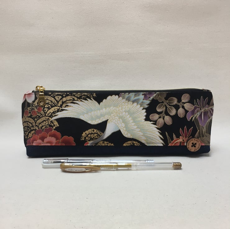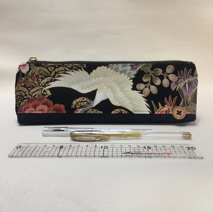 This stylish pencil case or pouch has been created from Japanese cotton fabric with a denim base. The fabric depicts a flying crane with in pinks and purples flowers and gold waves.