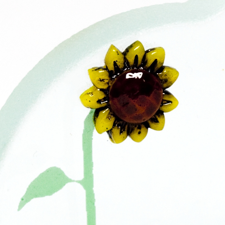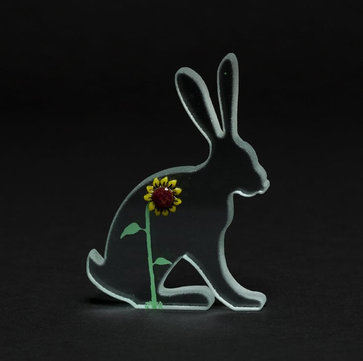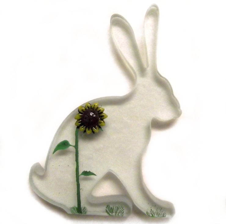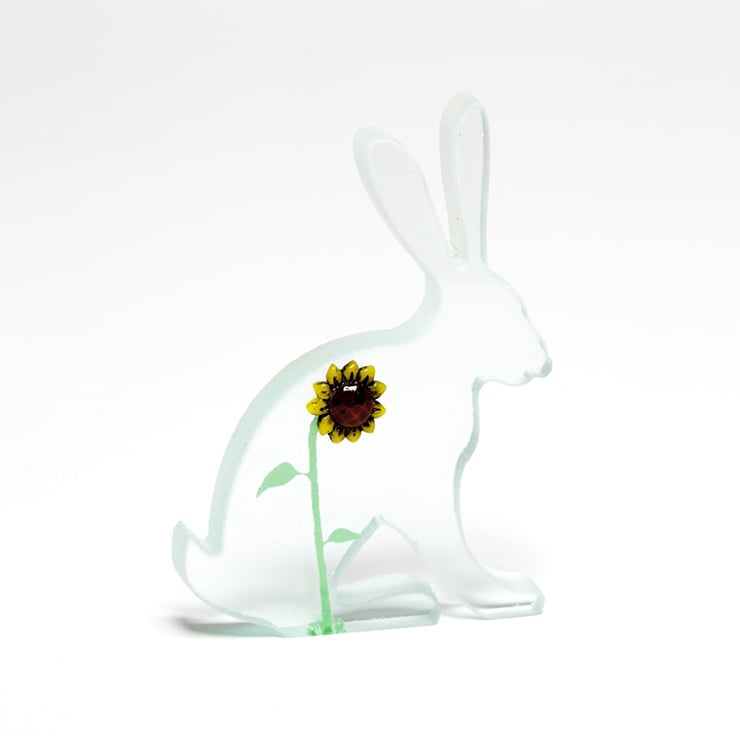 It has then been screen-printed by hand in green glass enamel, which is fired into place making it waterproof and resistant to sunlight. The sunflower has then been cast in glass powder, before being hand-painted in kiln fired enamels and fused onto the hare. All my kiln-fired pieces are carefully digitally annealed and cooled for strength and safety.