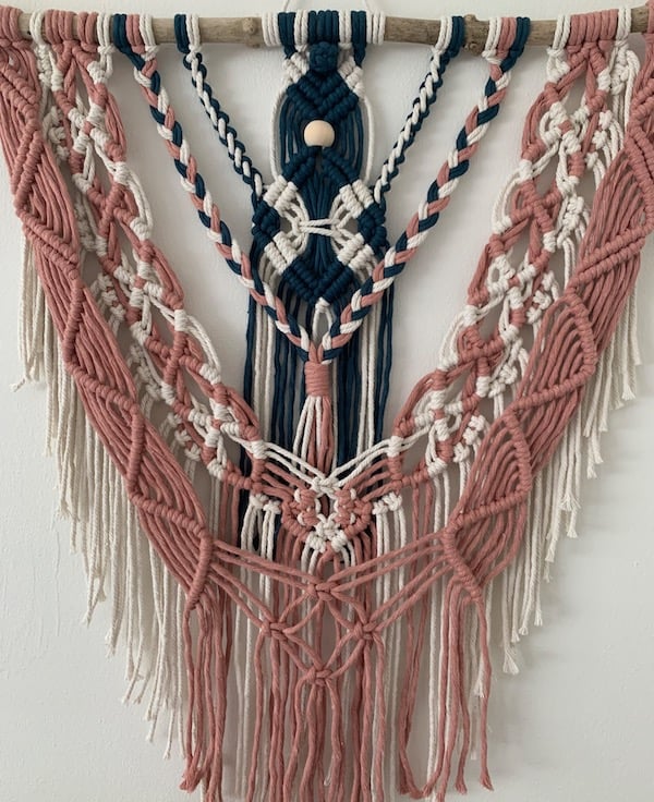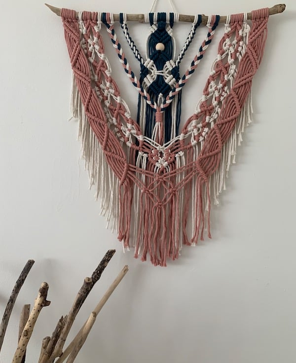 An elegant macrame wall hanging that will brighten any room and mood! This piece is made with three colours in soft, quality single twist cords and hangs on a 51cm natural hazel wood branch with an added wooden bead.