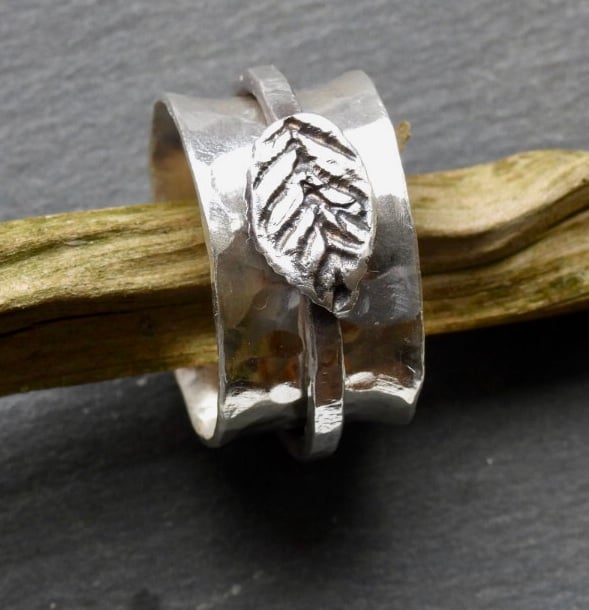 I love spinner rings, the whole concept of being able to do more with the ring than simply wearing it. The hammered surface really catches the light and adds to the overall effect. The leaf charm is one of a series that I hand craft and apply where I can!
