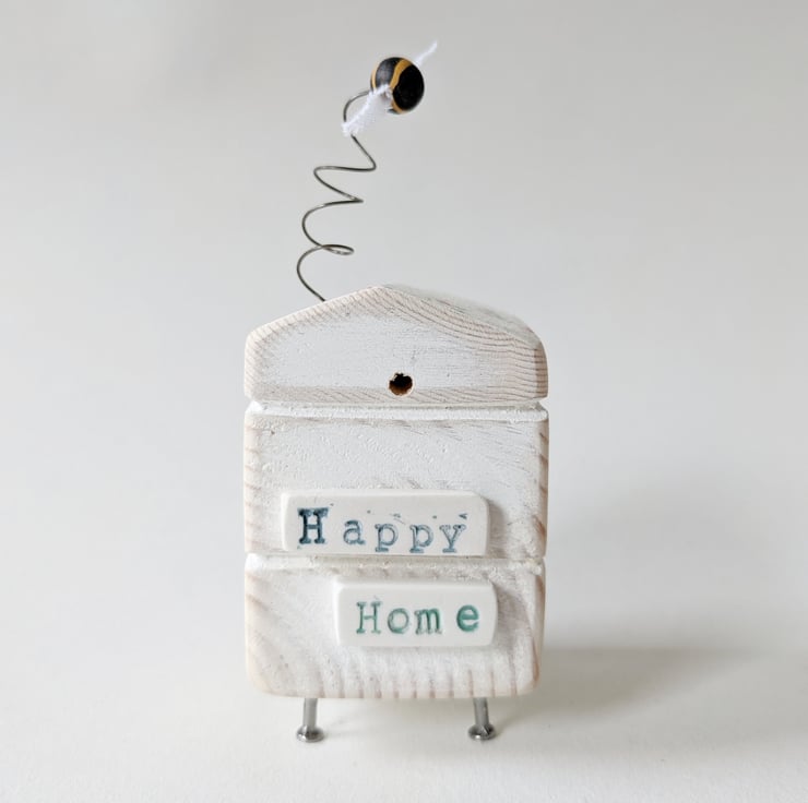 Painted white and sanded smooth the roof of the hive is adorned with flowers and the little bee dances on a bendy wire. The sign on the front reads 'Happy Home' and is made from polymer clay which is shaped, fired and painted.